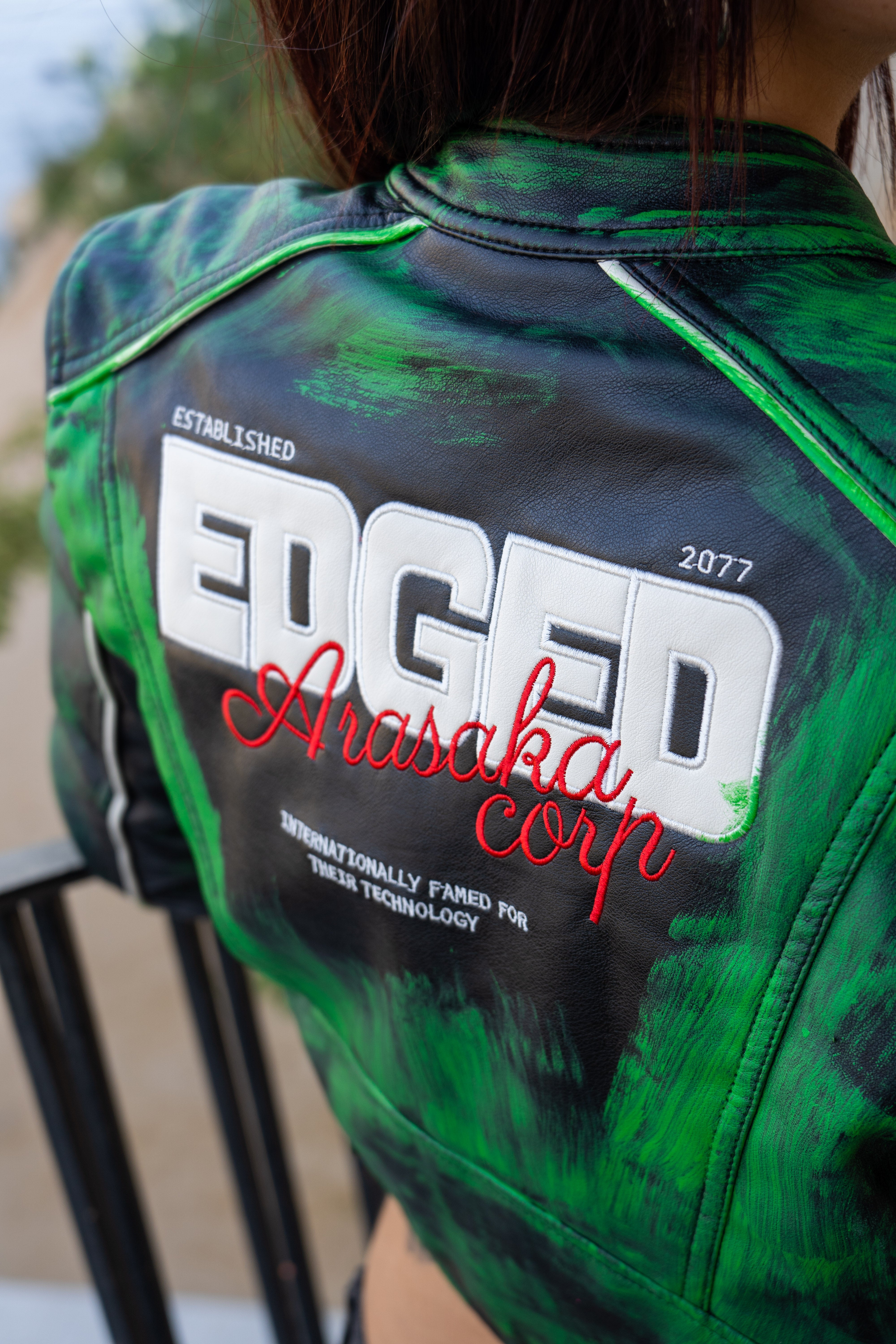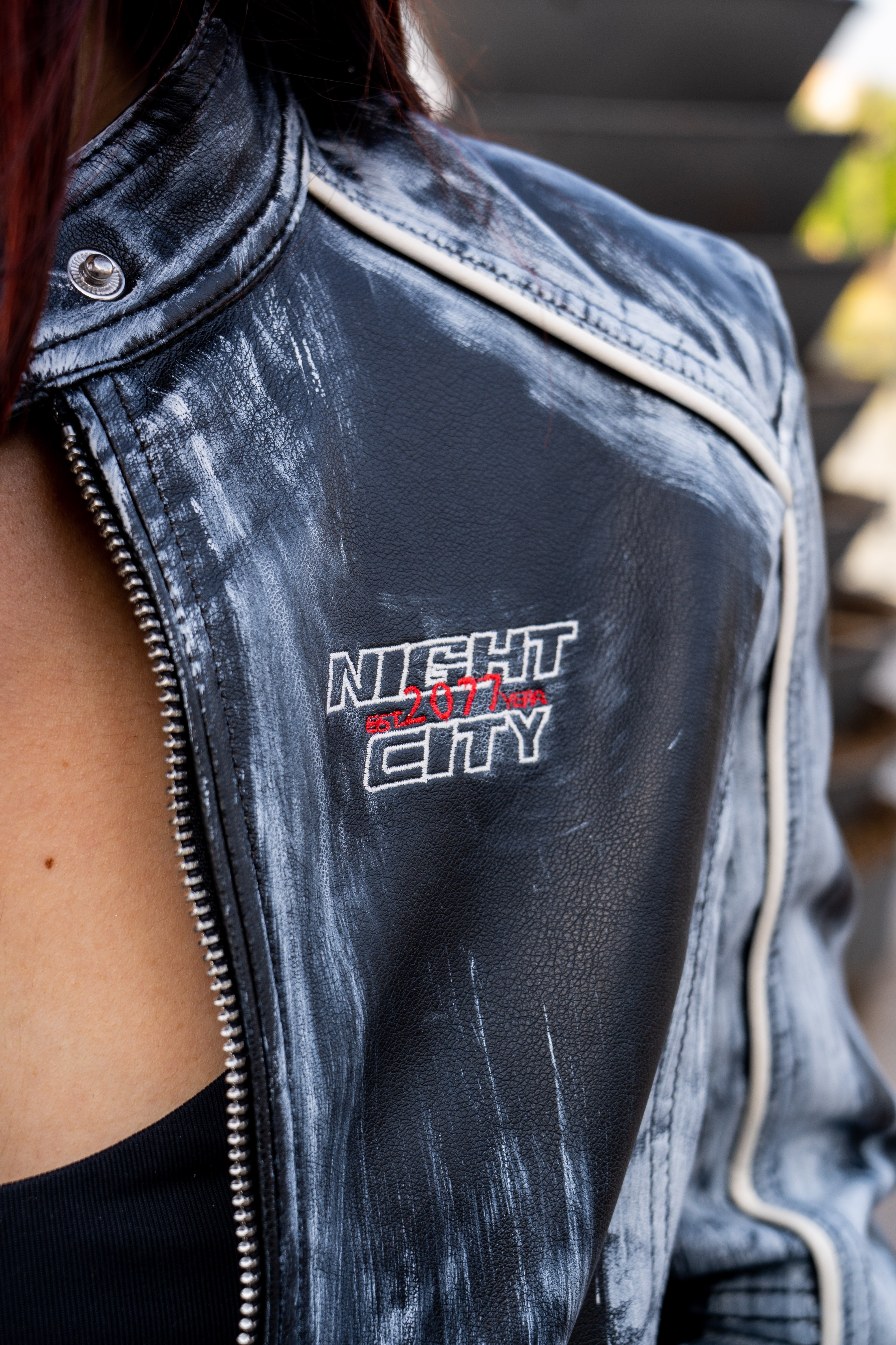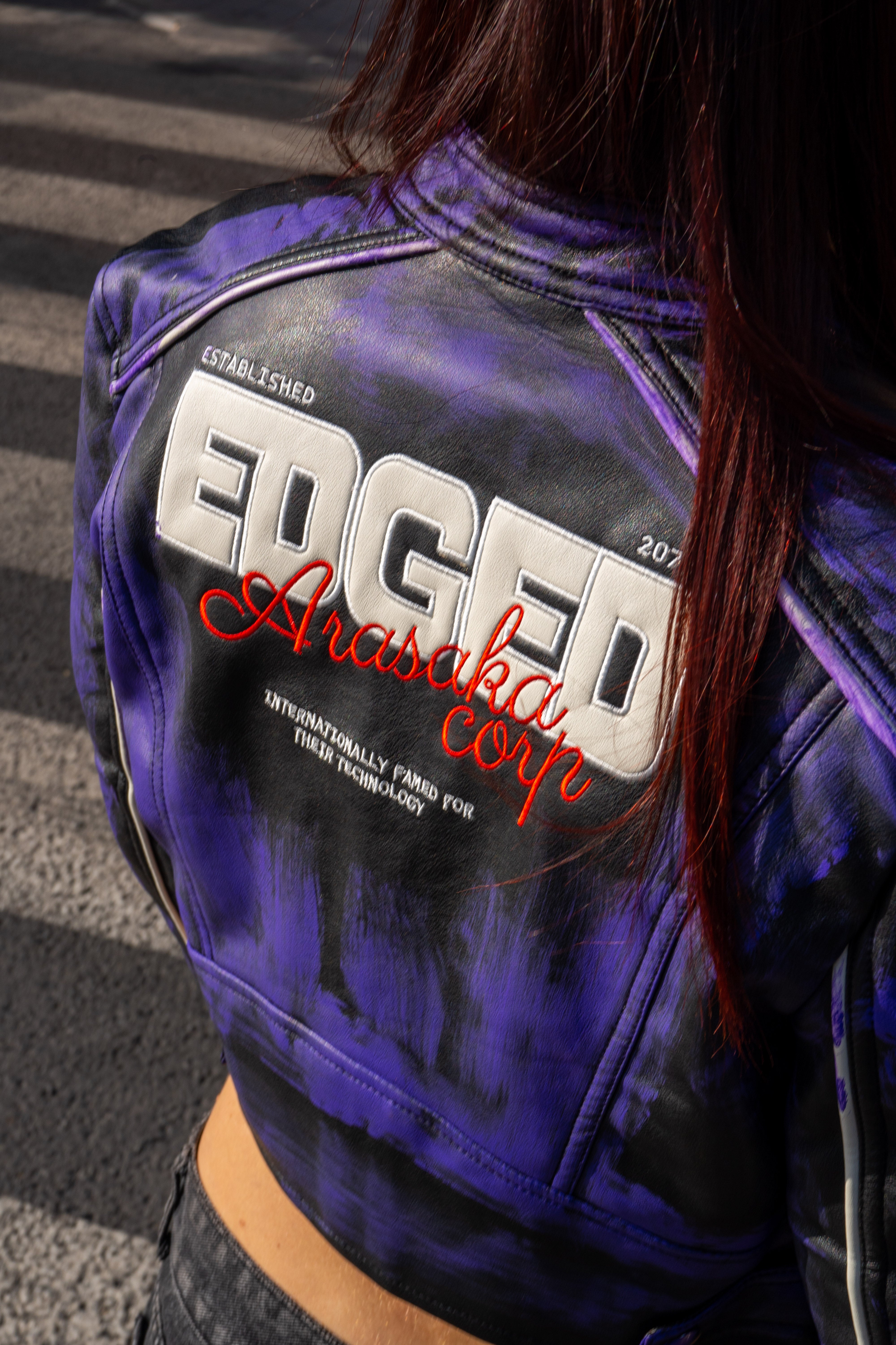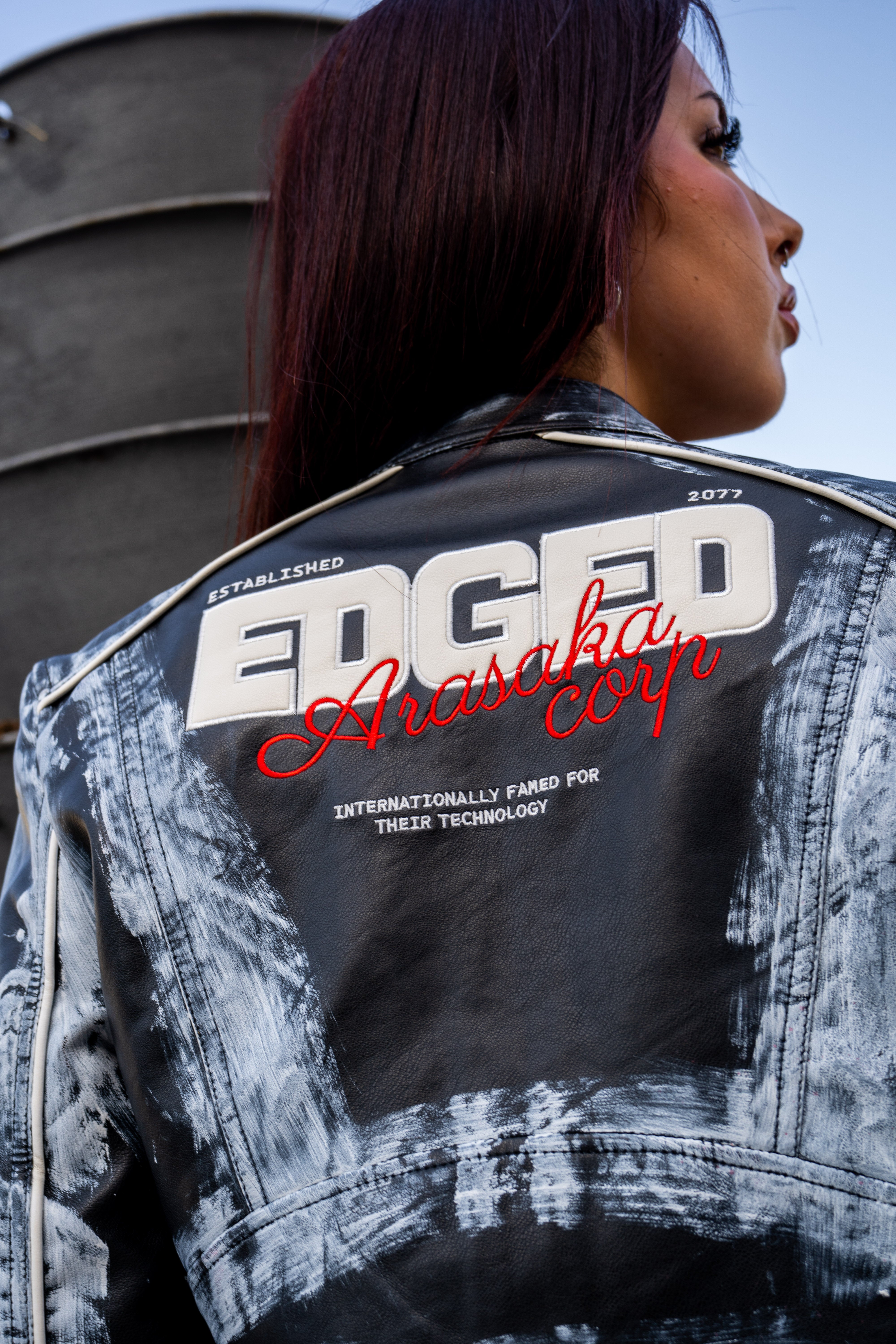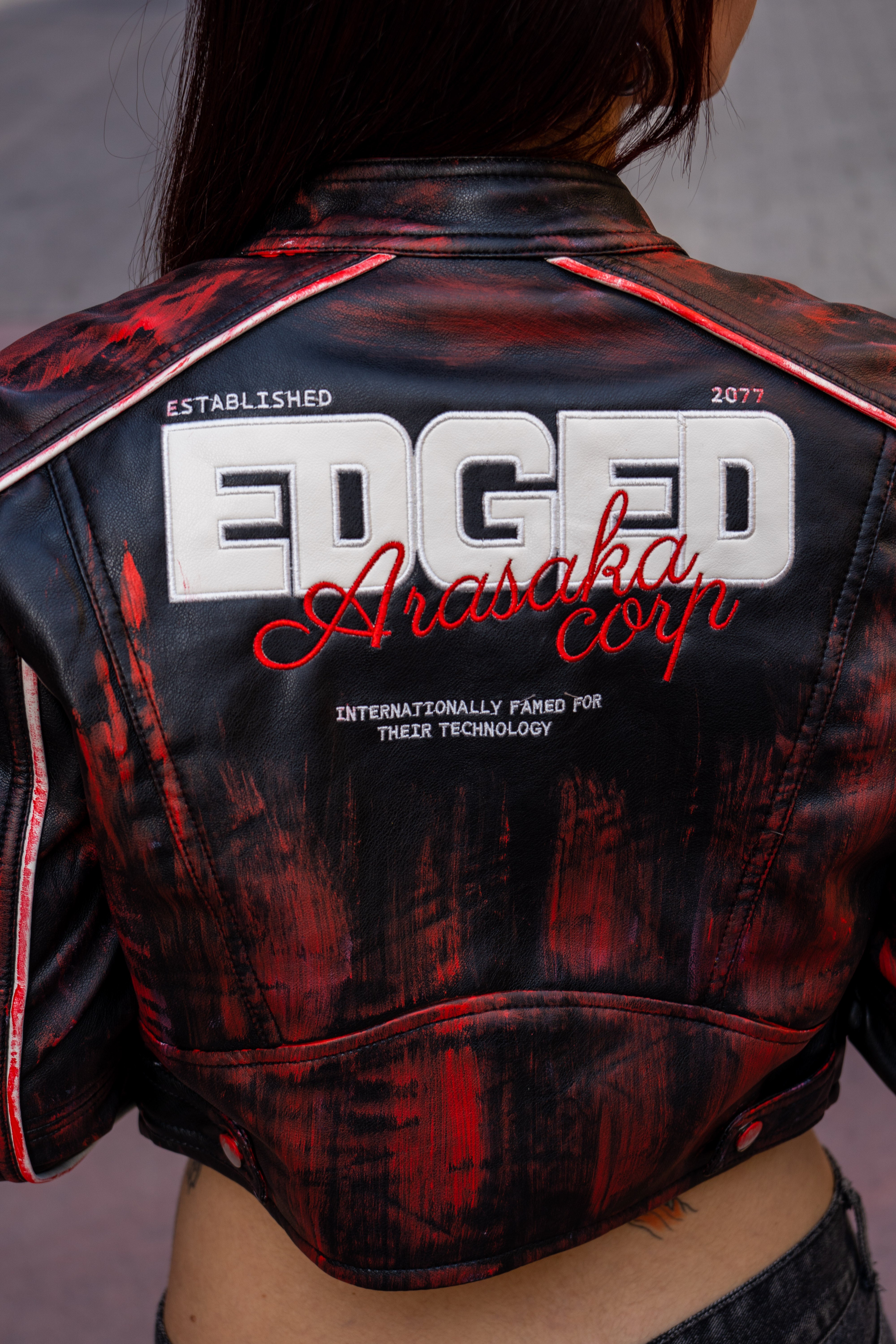 Chaqueta biker cropped de piel sintética con efecto de pinceladas. Presenta cuello de solapa, cierre de cremallera y bordado de "NIGHT CITY" en el pecho y "EDGED Arasaka Corp" en la espalda, con detalles de rayas blancas en las mangas.