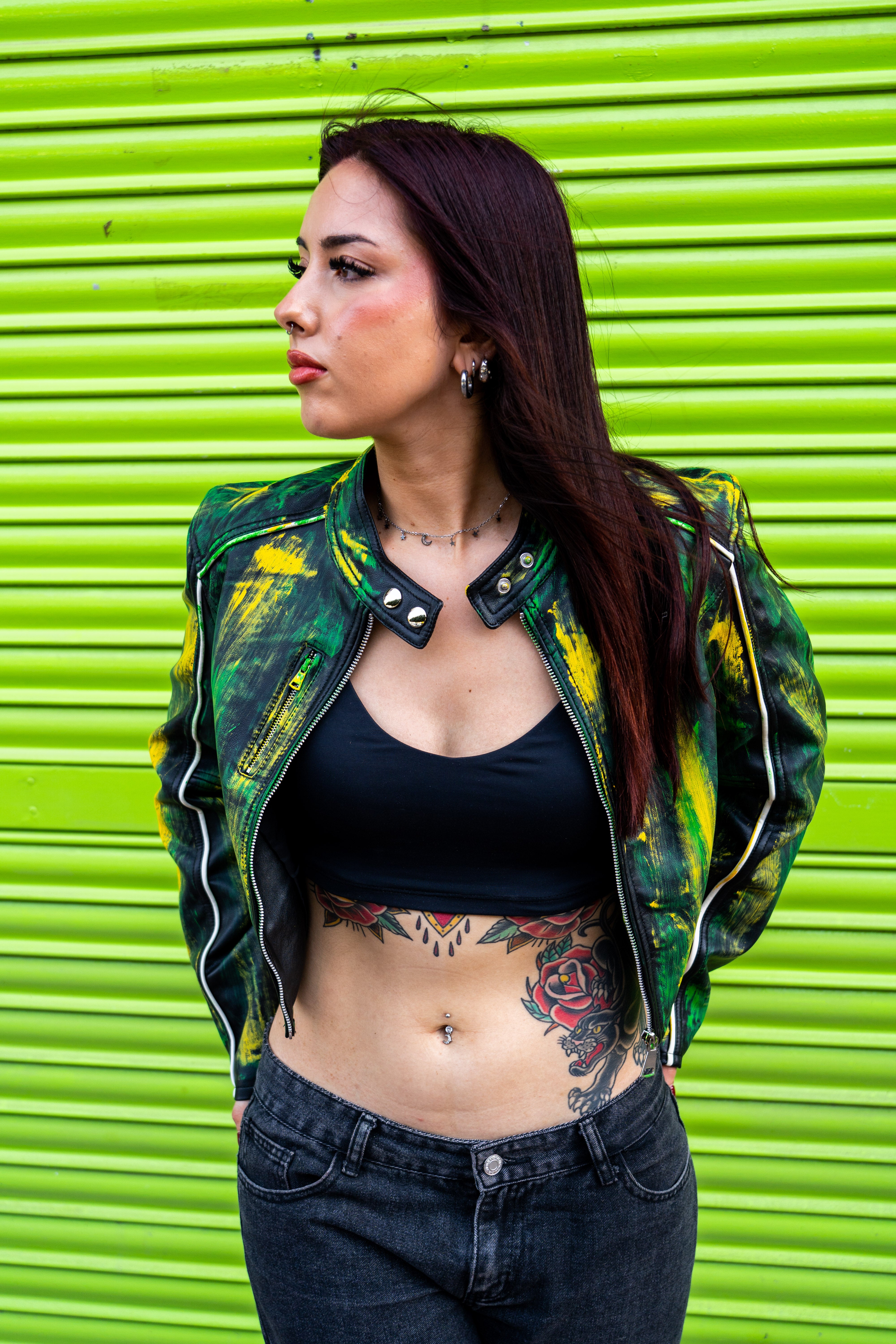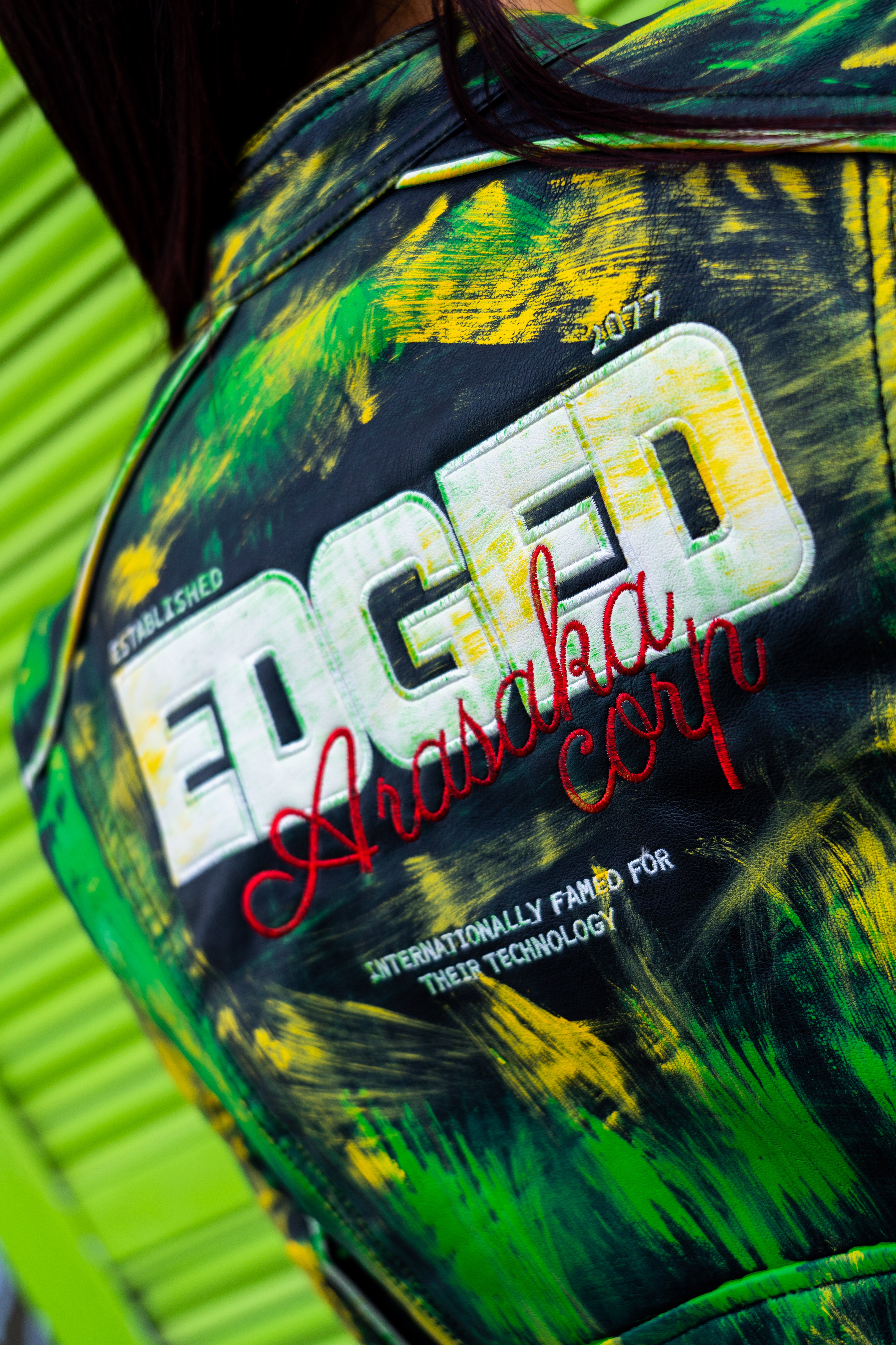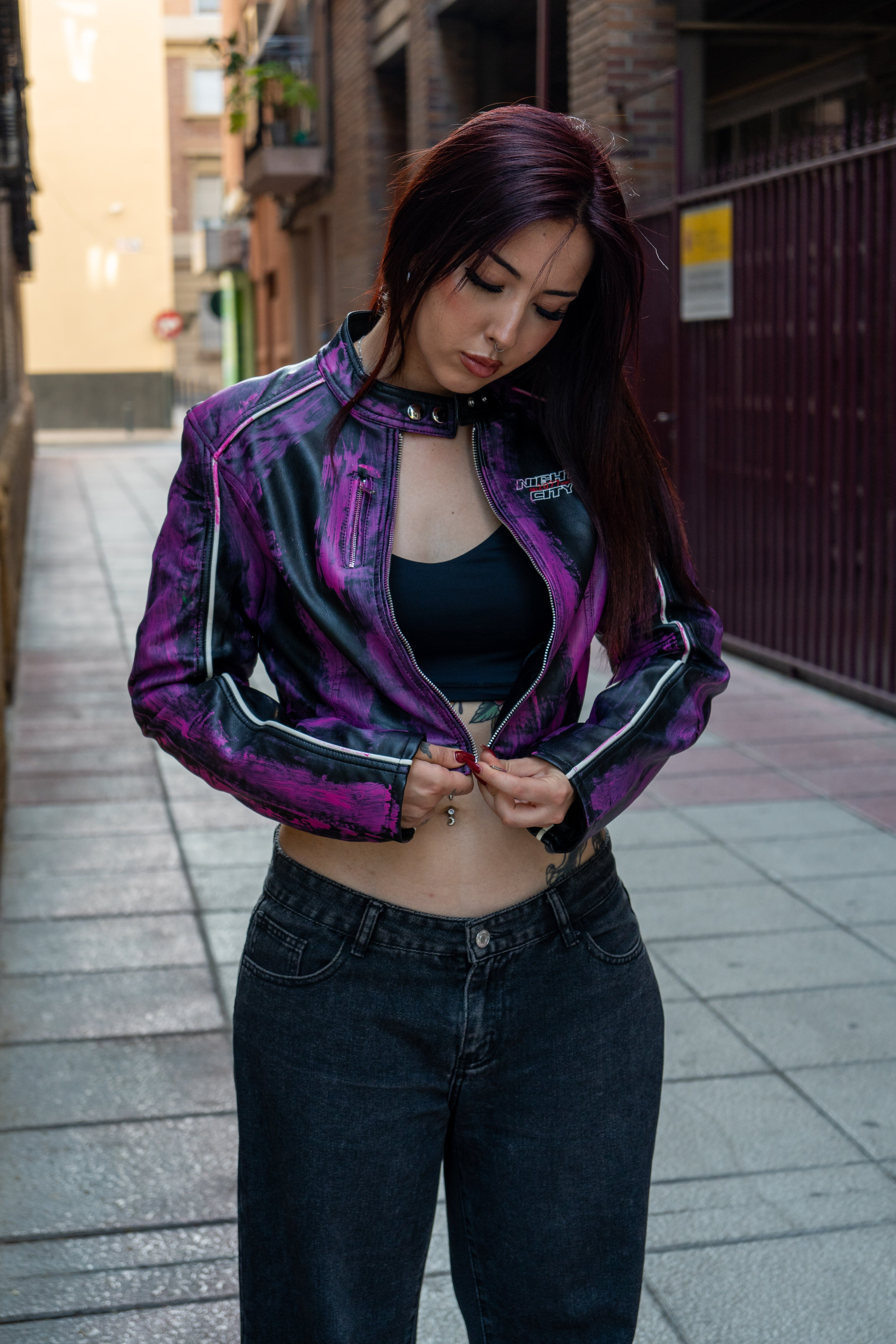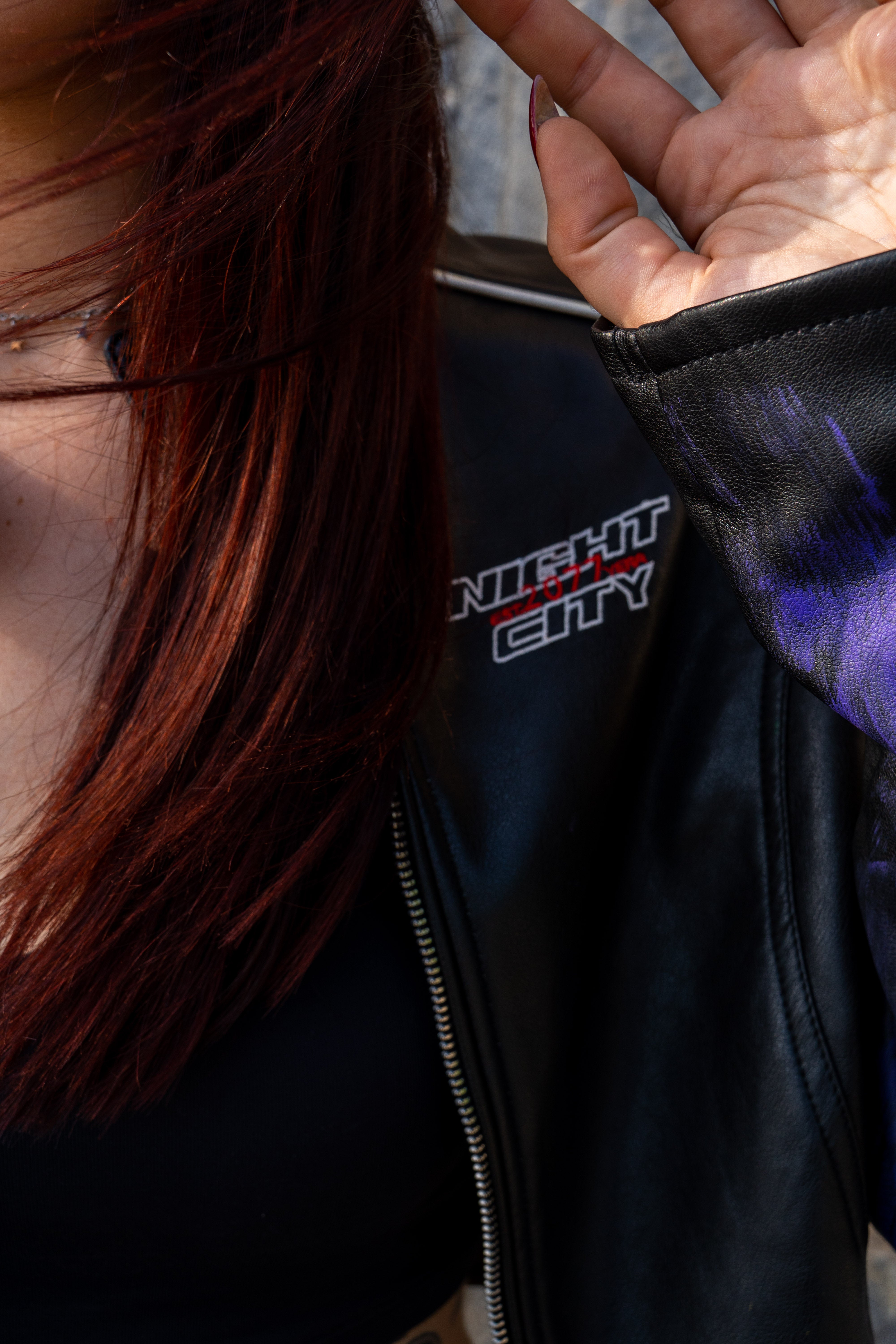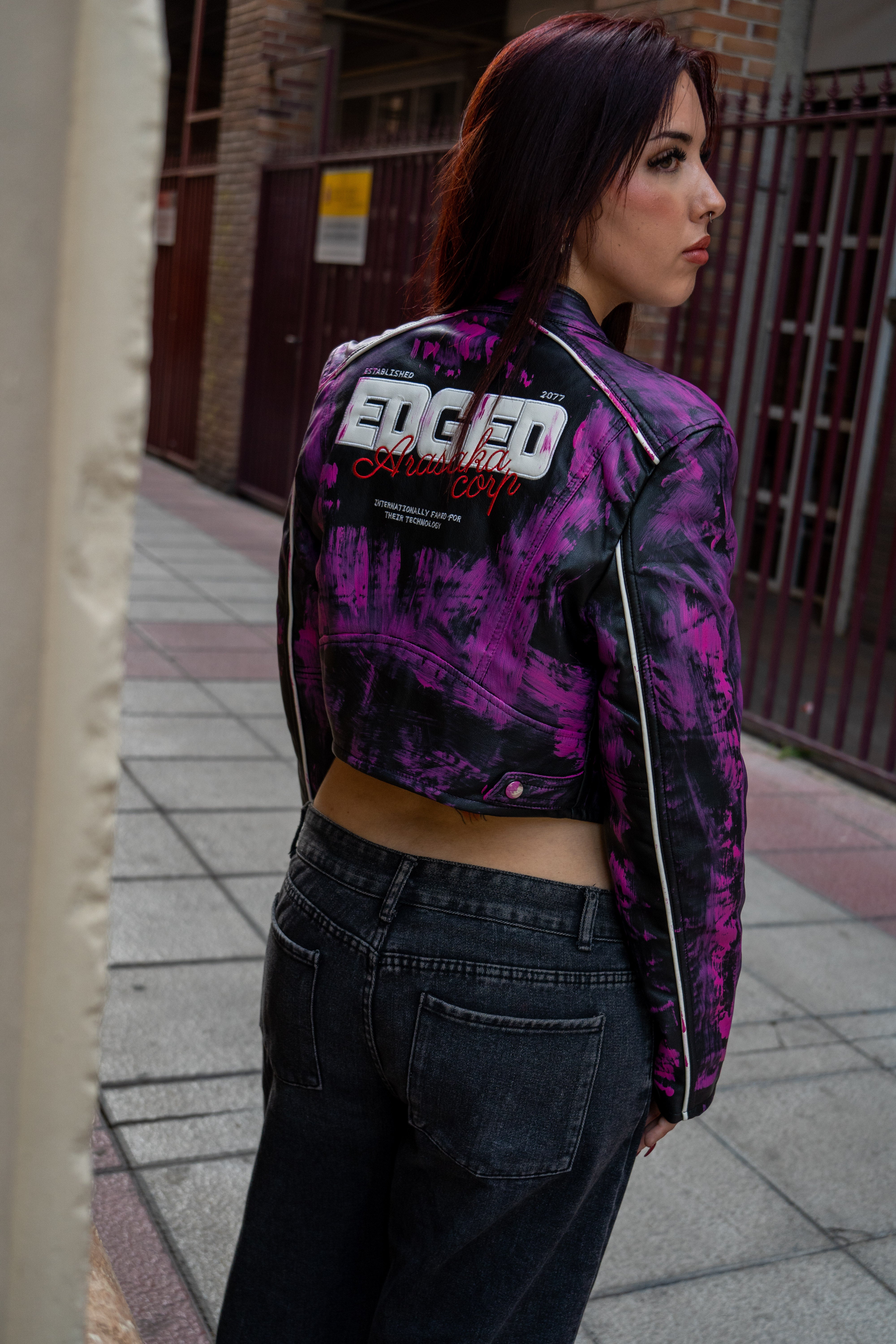 Chaqueta biker cropped de piel sintética con efecto de pinceladas. Presenta cuello de solapa, cierre de cremallera y bordado de "NIGHT CITY" en el pecho y "EDGED Arasaka Corp" en la espalda, con detalles de rayas blancas en las mangas.
