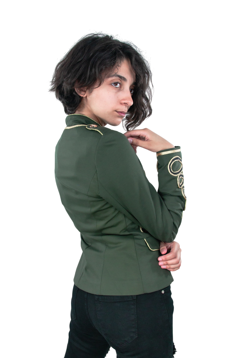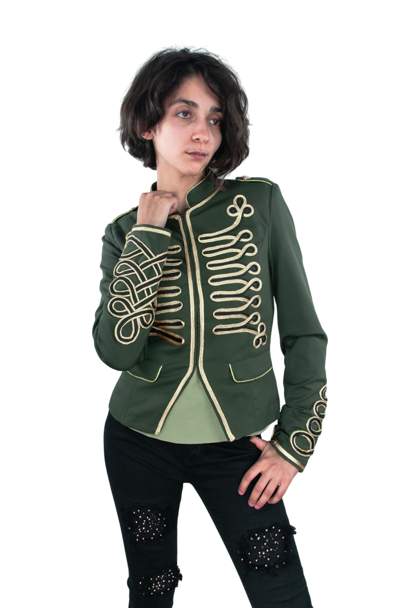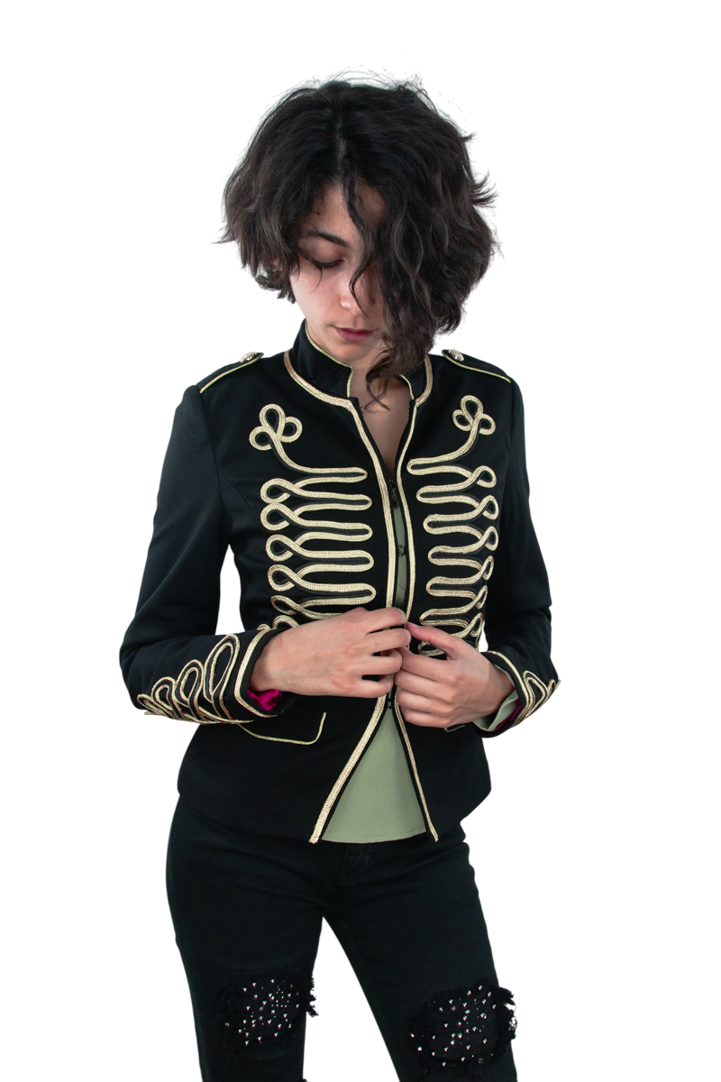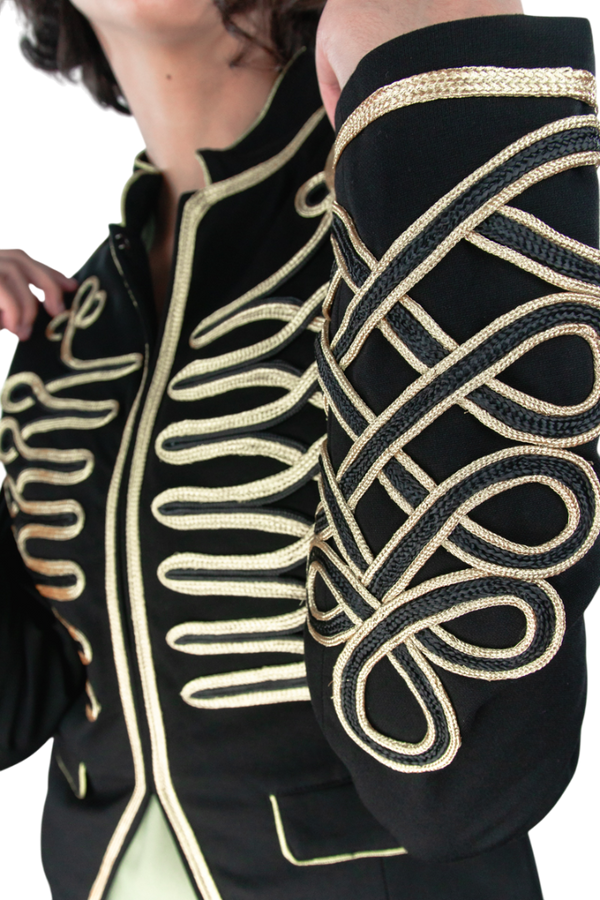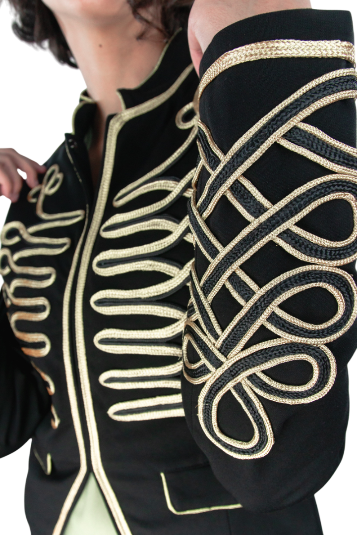 Chaqueta militar entallada con bordados dorados. Cierre de corchetes. Detalle de botones metálicos y charreteras.