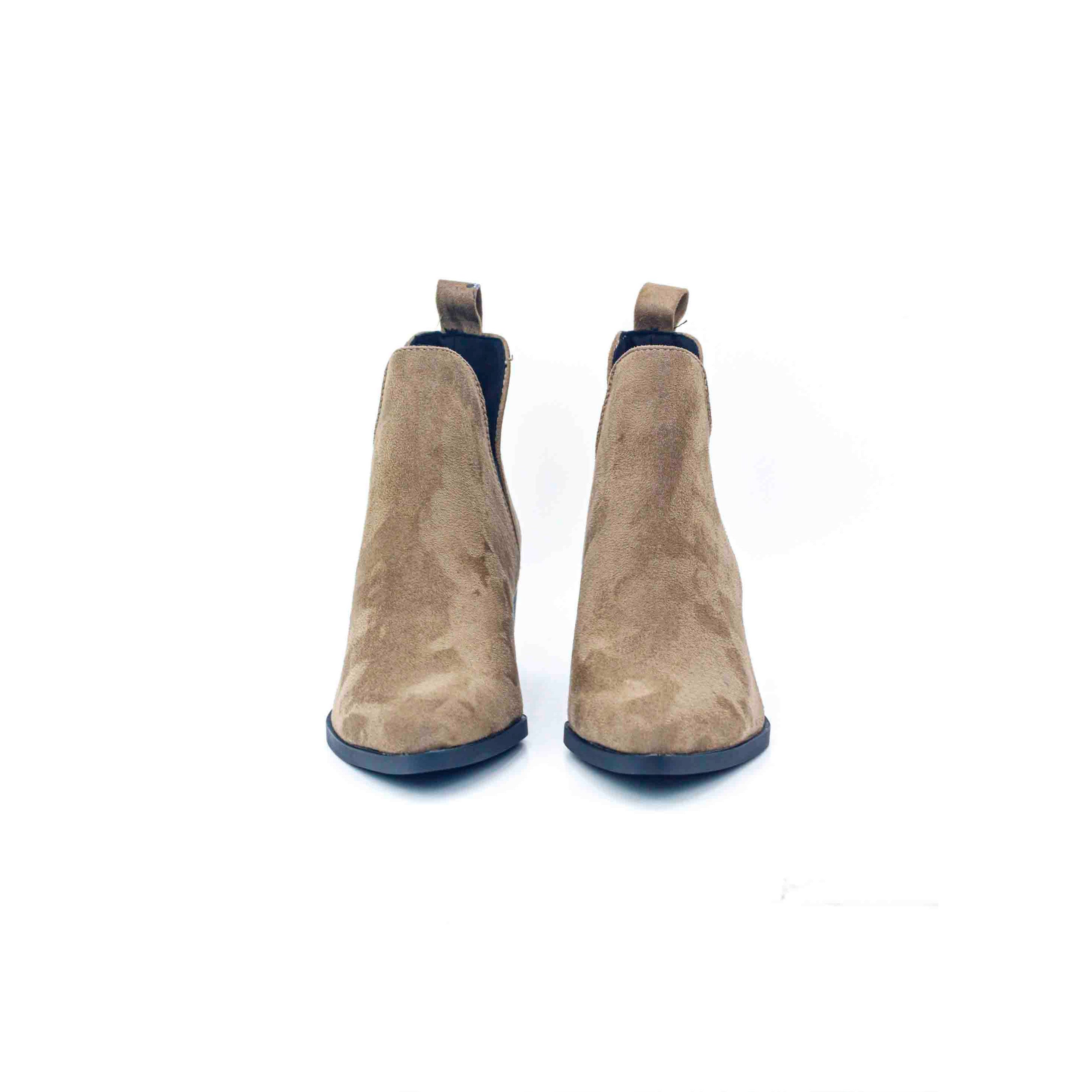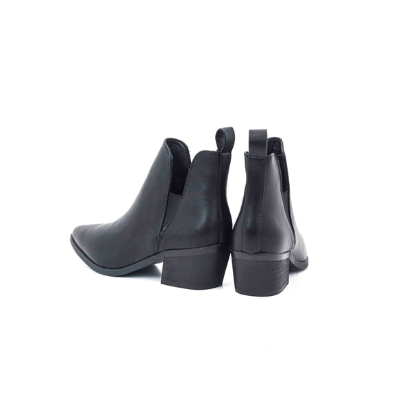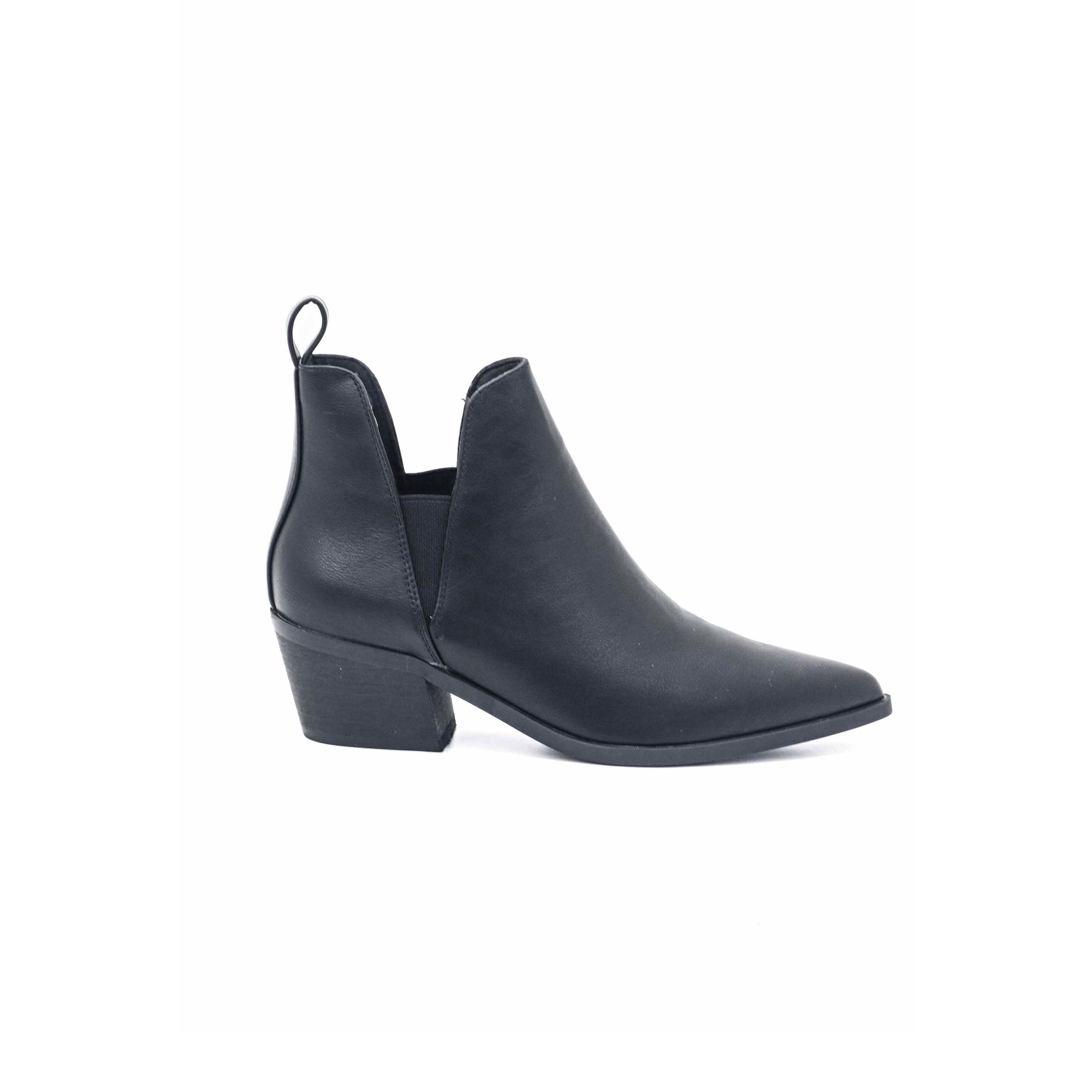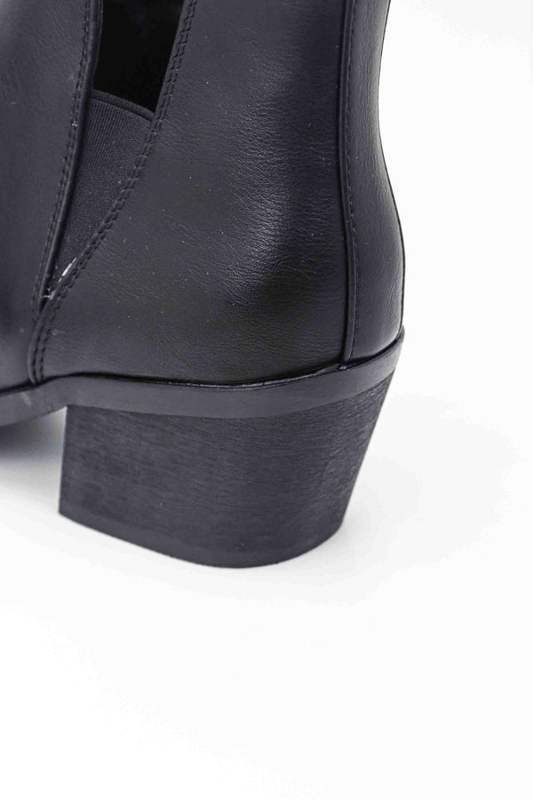 Botines de piel sintética negra y ante sintético beige, con un diseño moderno de corte en V. El tacón bajo y ancho proporciona comodidad y estilo, ideales para cualquier ocasión.