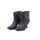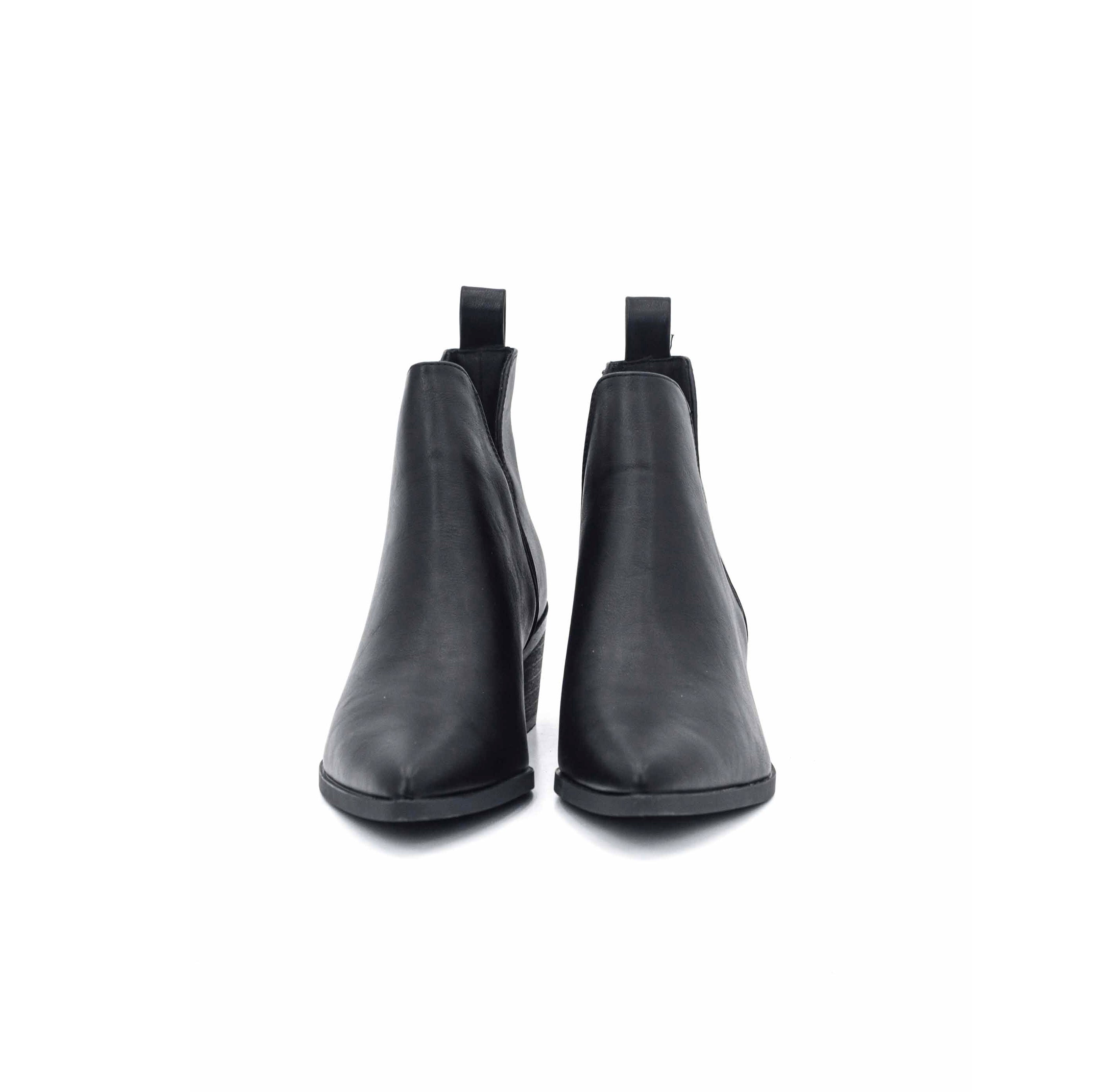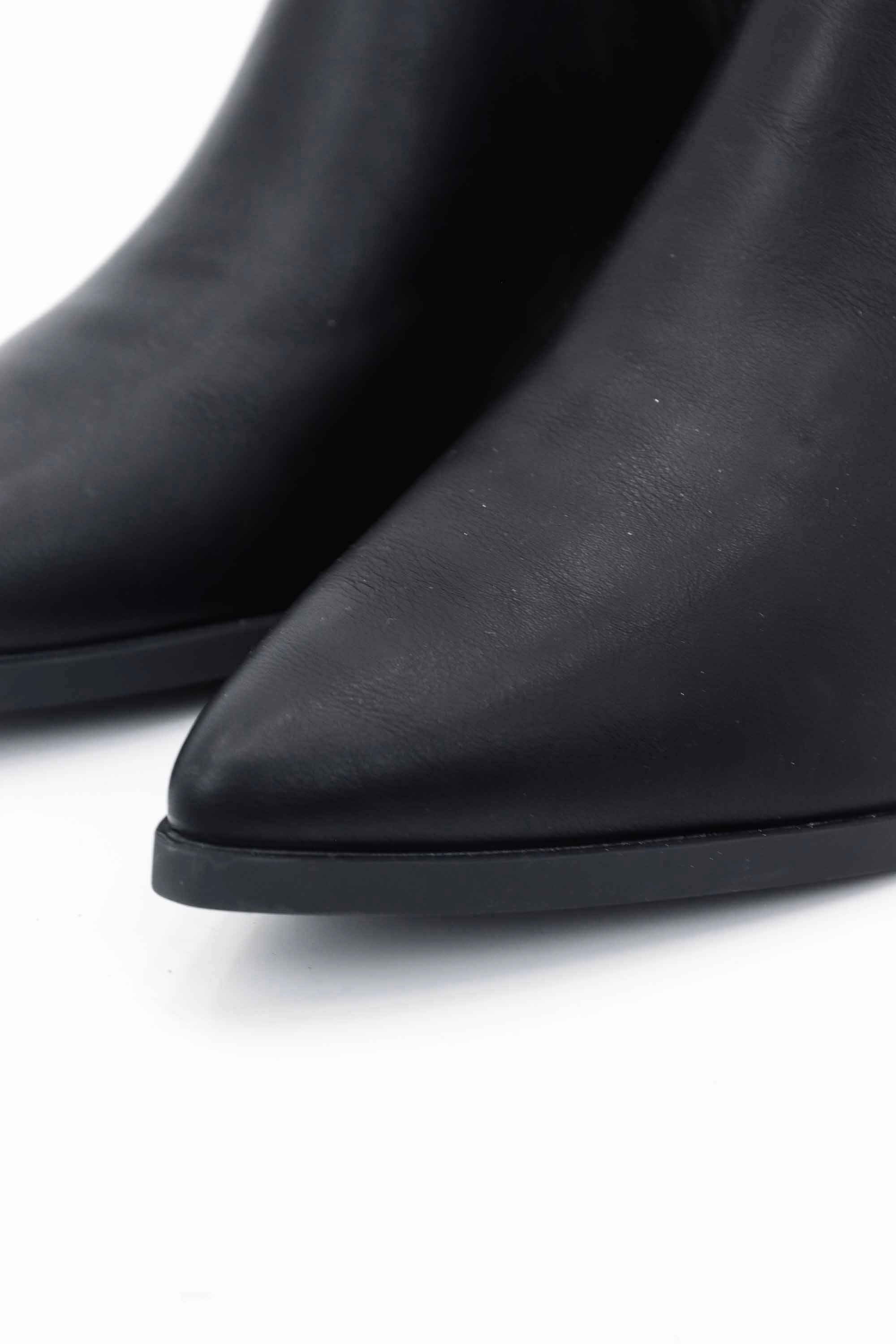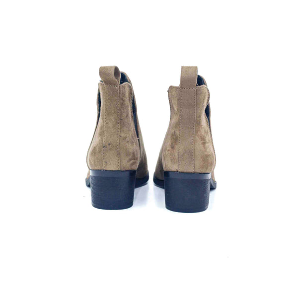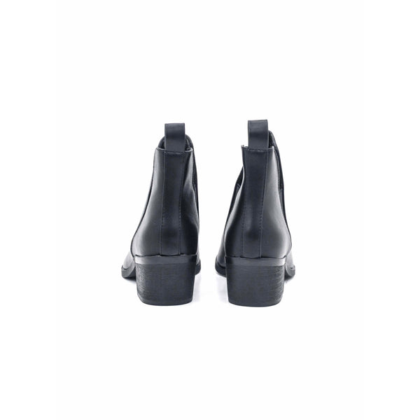 Botines de piel sintética negra y ante sintético beige, con un diseño moderno de corte en V. El tacón bajo y ancho proporciona comodidad y estilo, ideales para cualquier ocasión.
