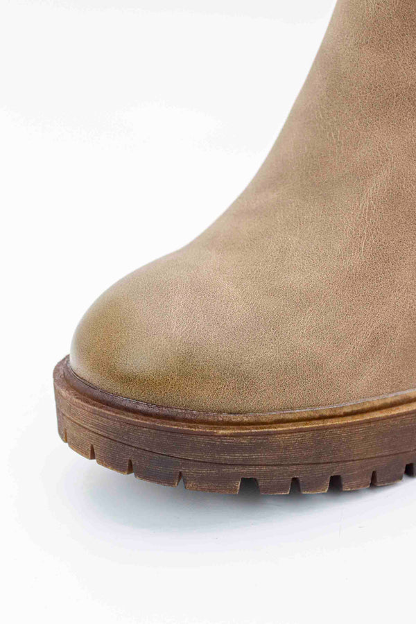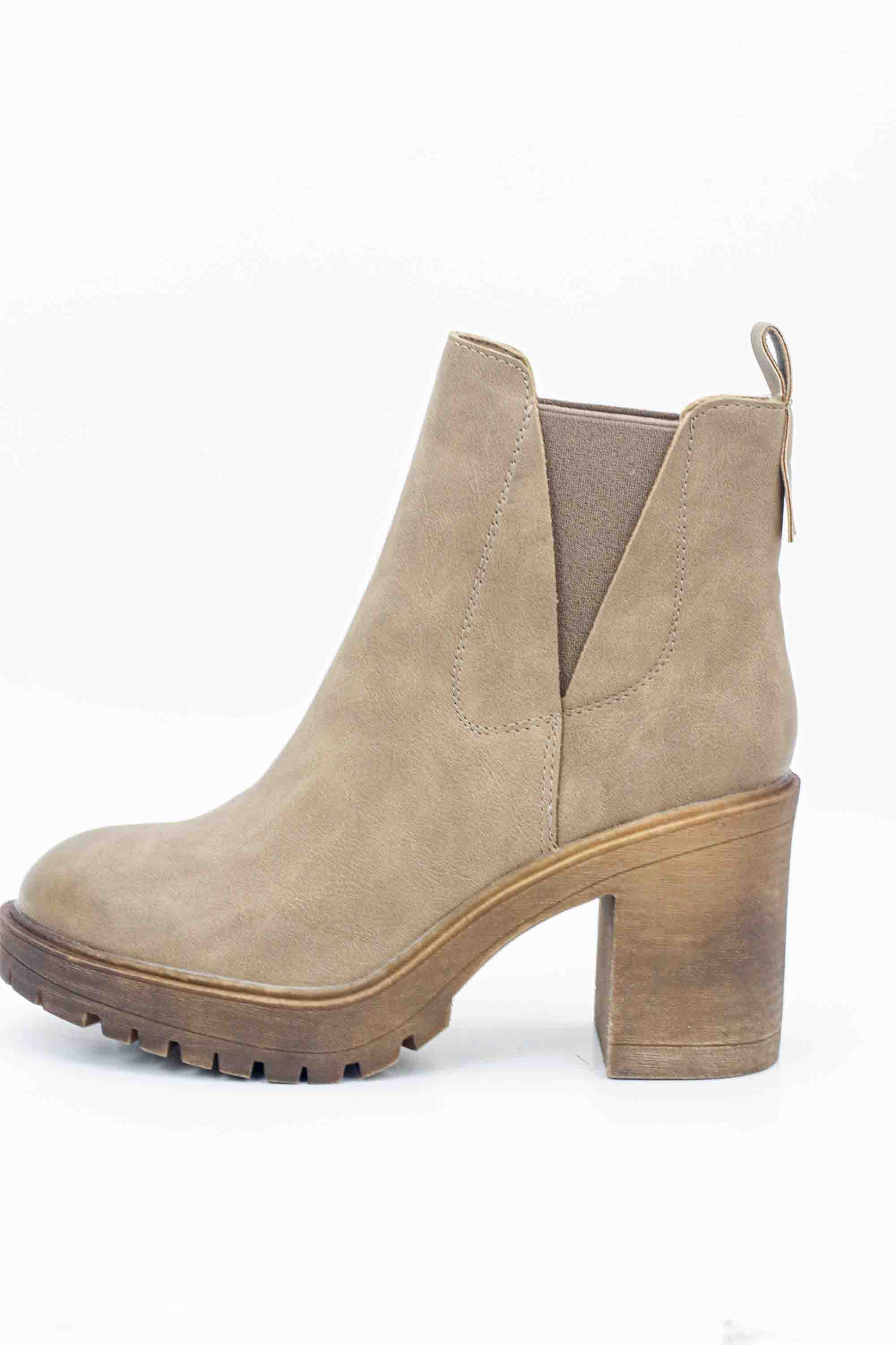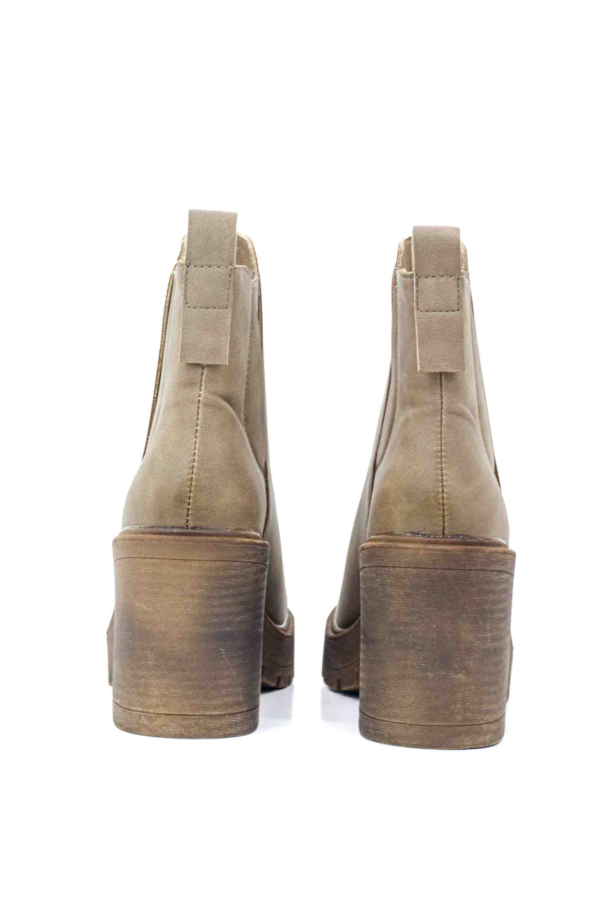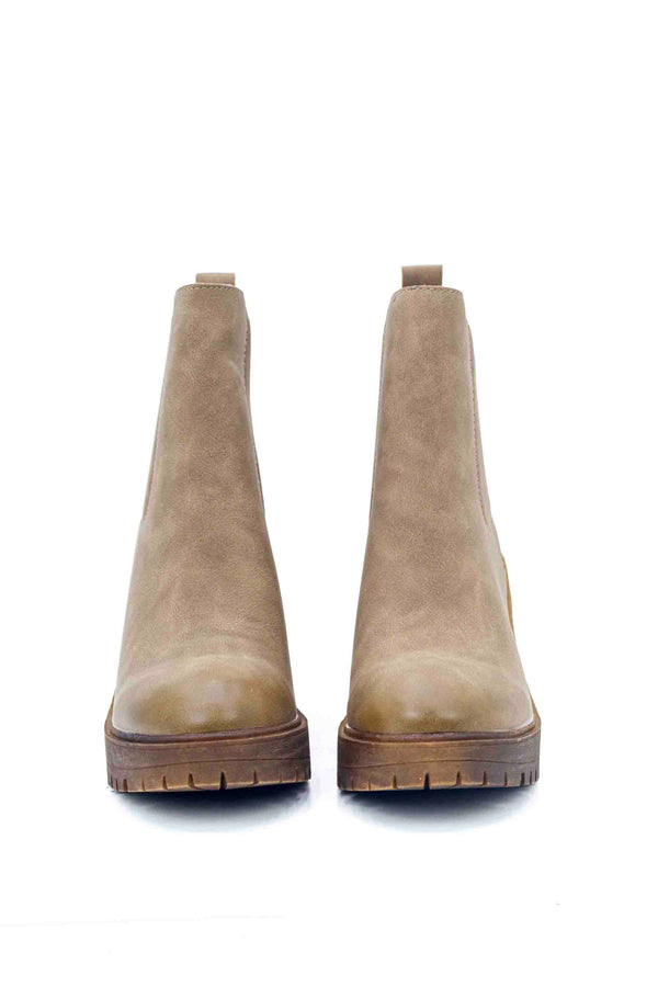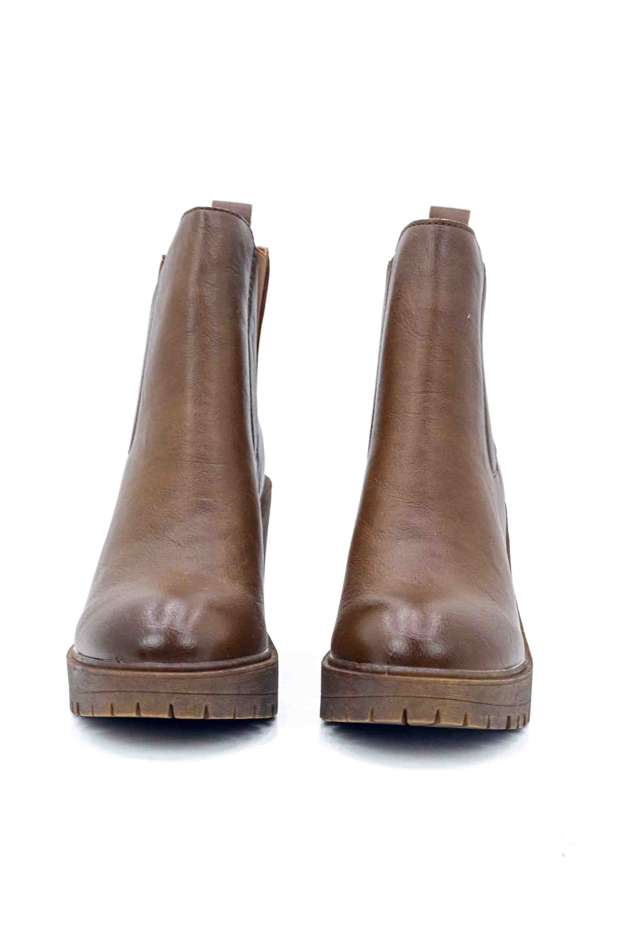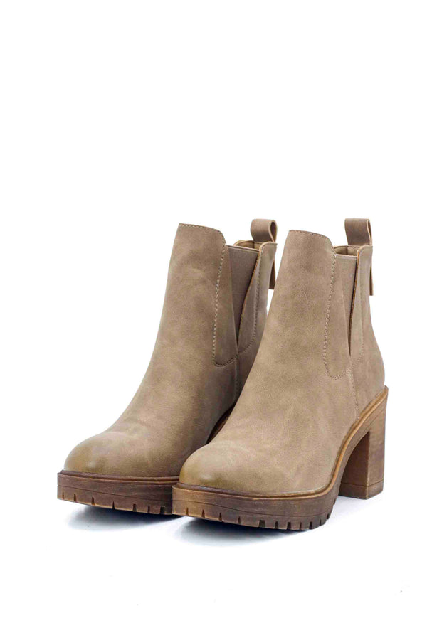 Botín en color topo, negro y marrón con suela dentada y tacón de bloque robusto, diseñados para un uso cómodo y duradero. Su estilo Chelsea, con paneles elásticos laterales, facilita que te los puedas poner y quitar.