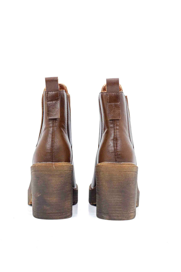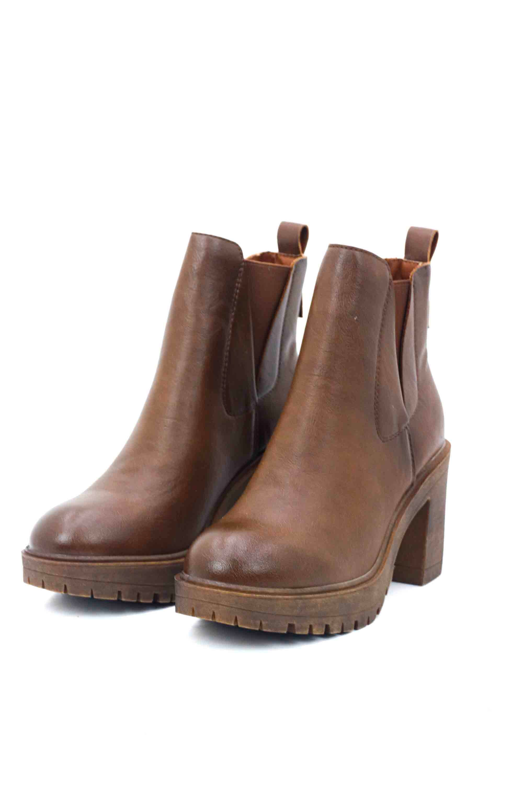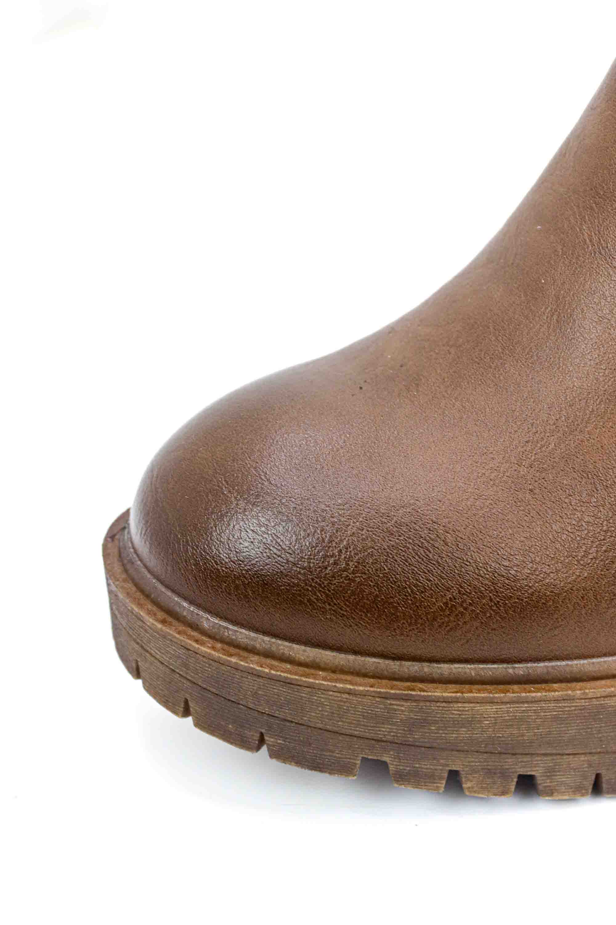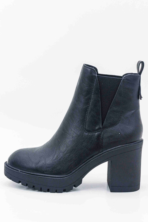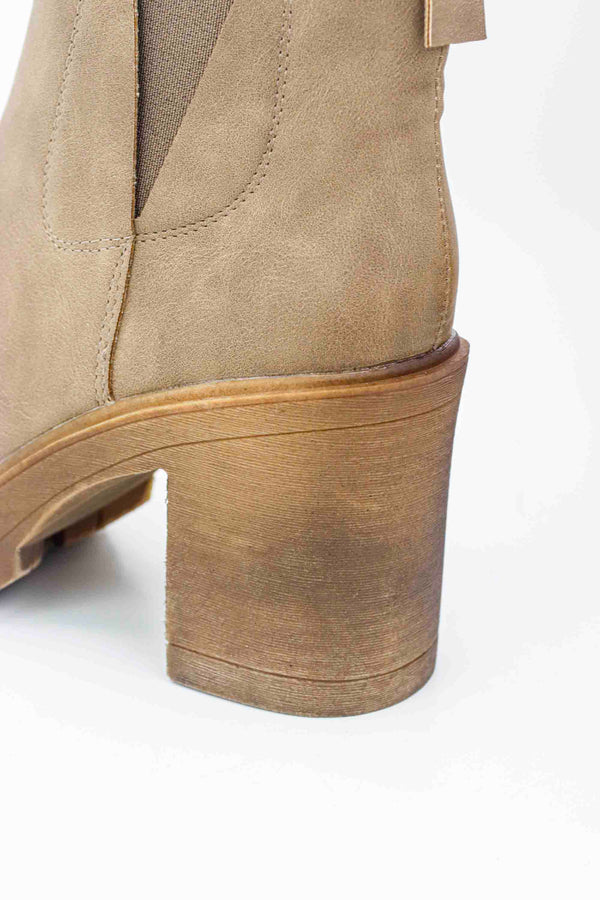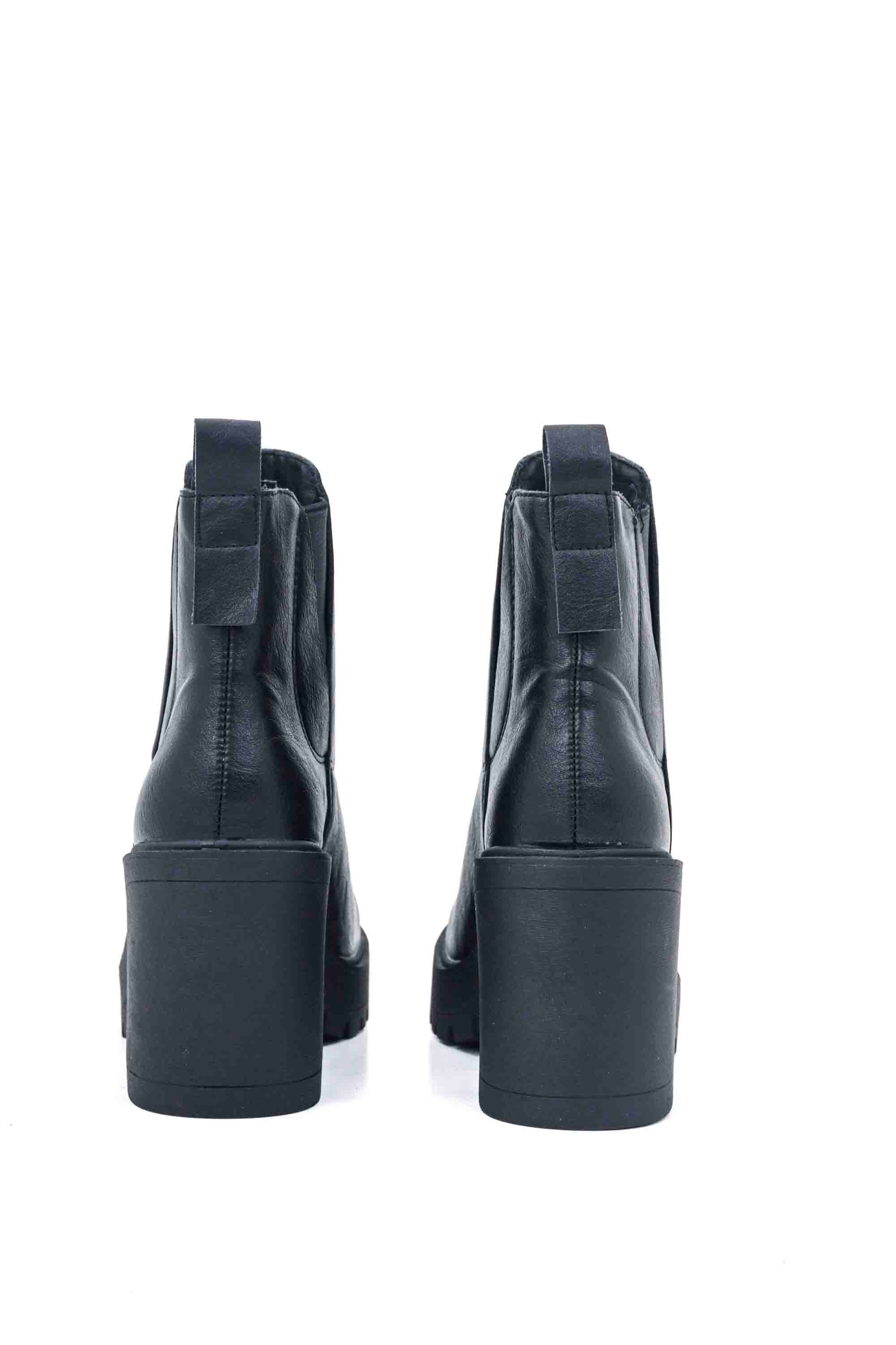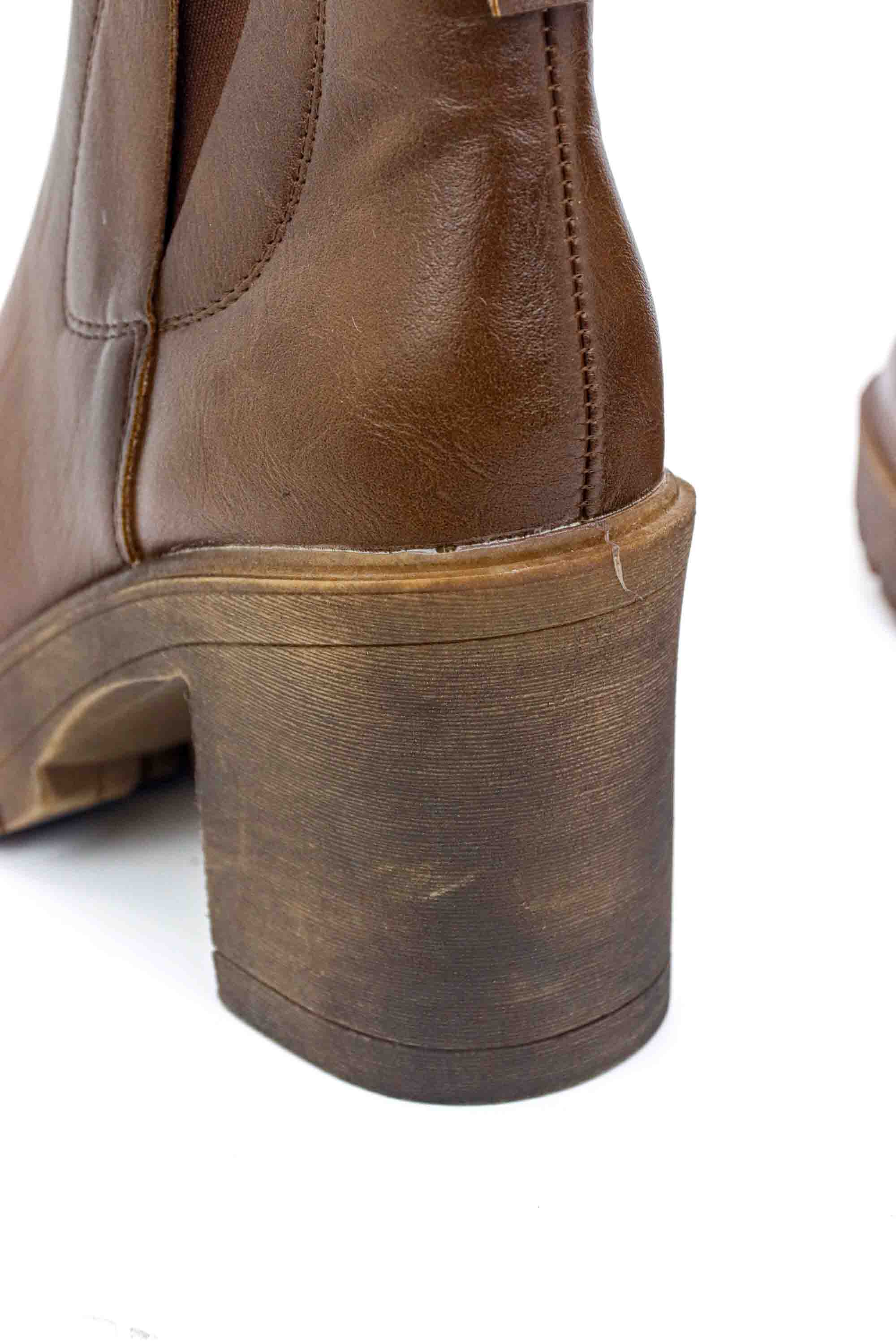 Botín en color topo, negro y marrón con suela dentada y tacón de bloque robusto, diseñados para un uso cómodo y duradero. Su estilo Chelsea, con paneles elásticos laterales, facilita que te los puedas poner y quitar.