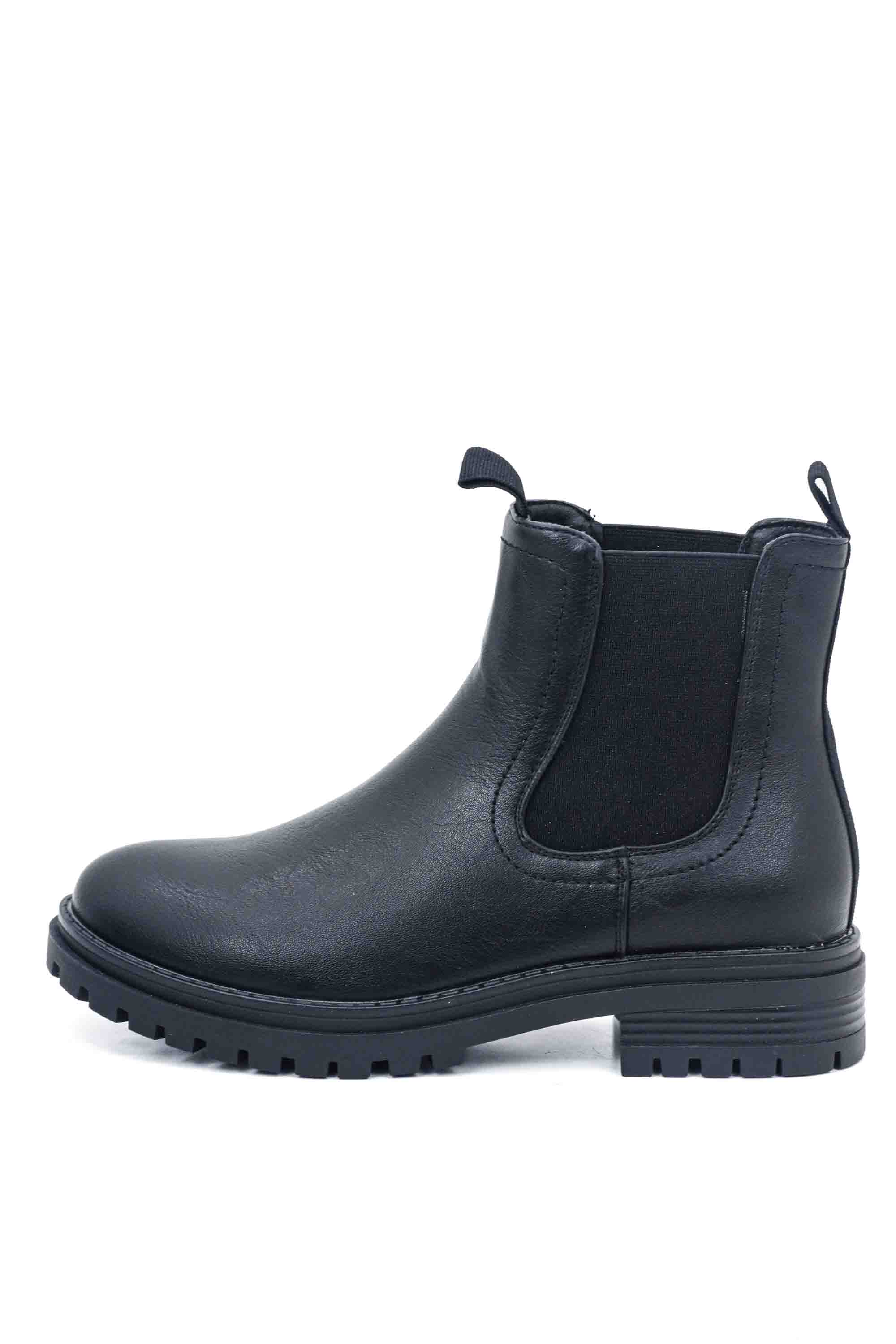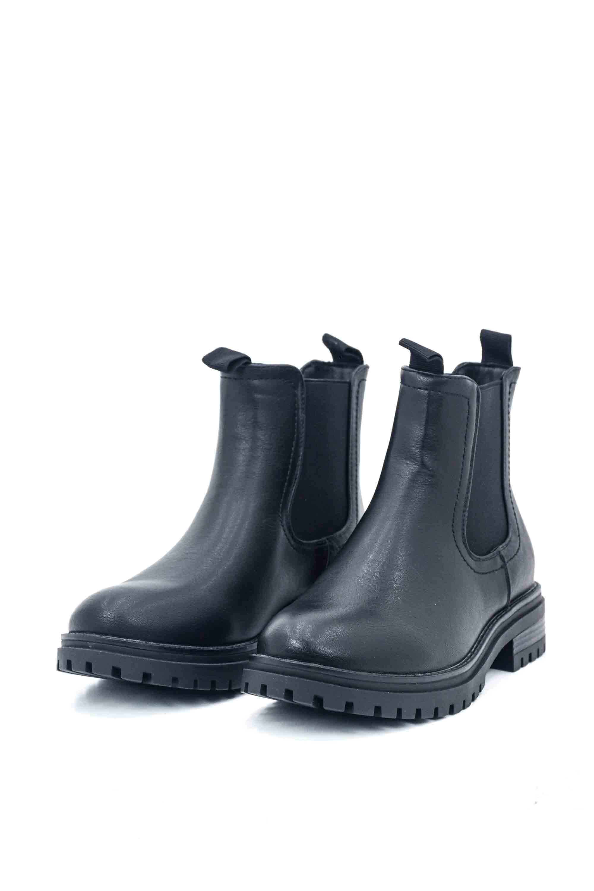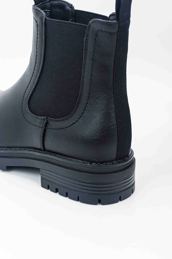 Botines chelsea negros para mujer con paneles laterales elásticos y una suela dentada robusta. Su diseño de cuero sintético liso ofrece un estilo clásico y versátil, ideal para el uso diario.
