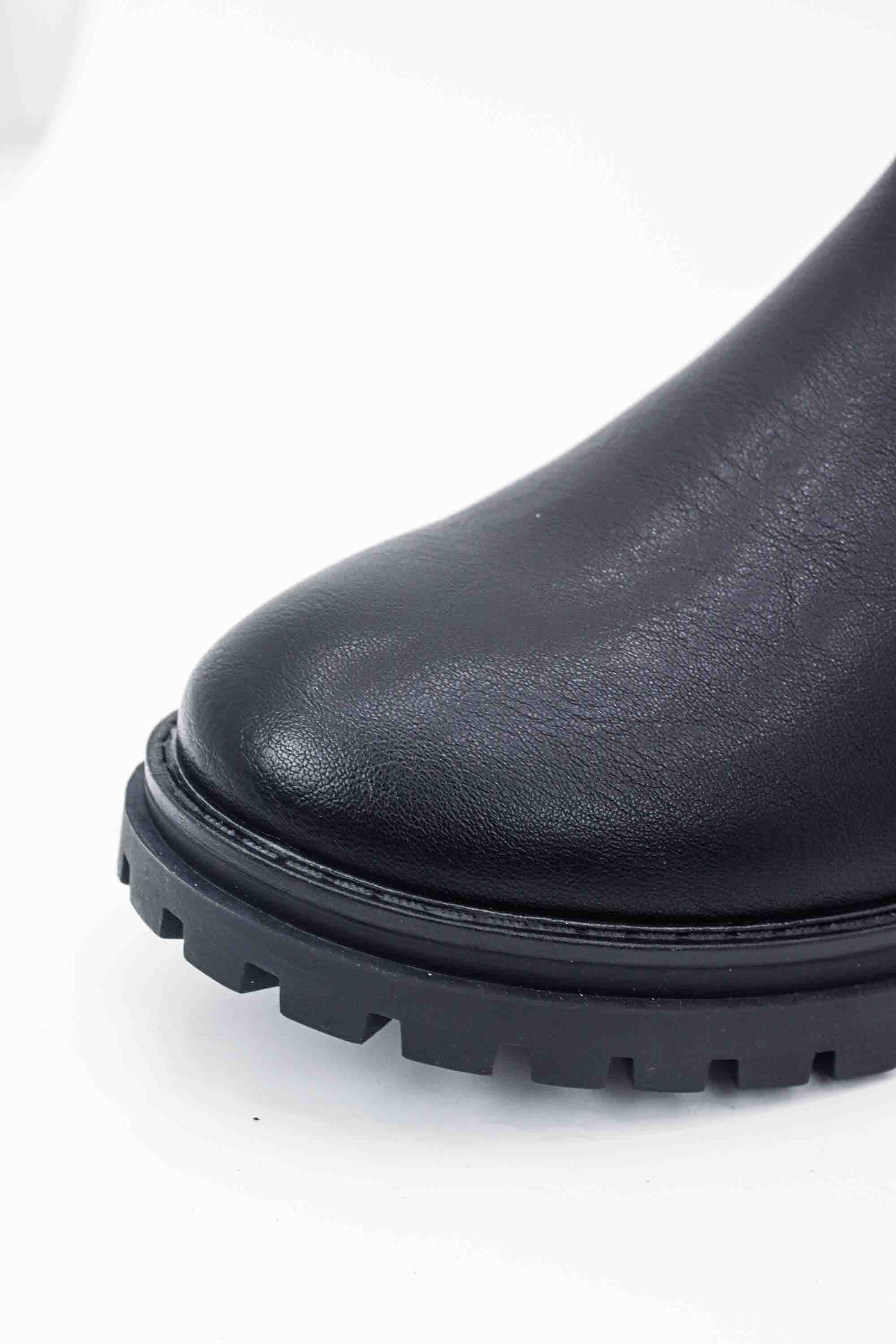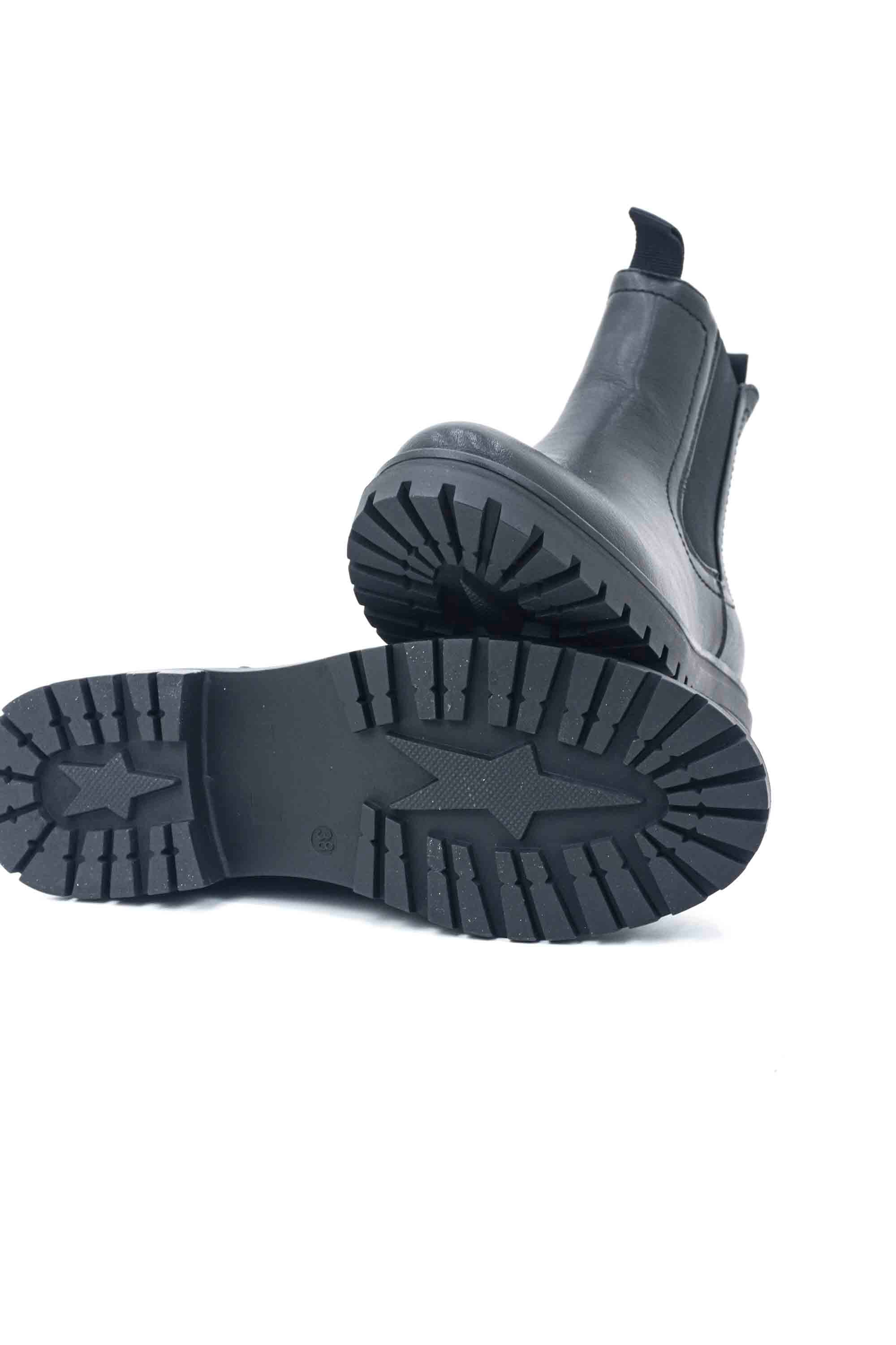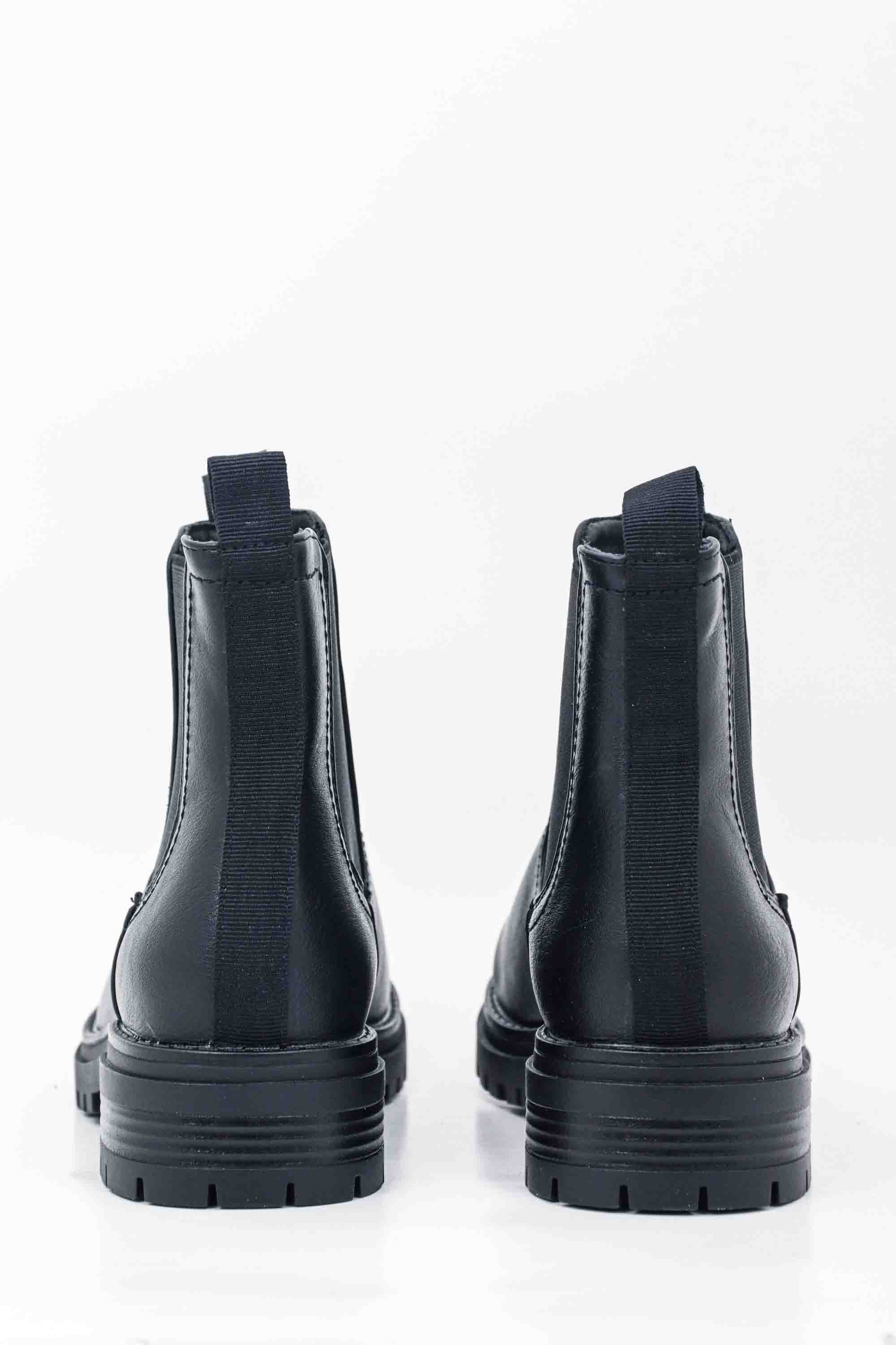 Botines chelsea negros para mujer con paneles laterales elásticos y una suela dentada robusta. Su diseño de cuero sintético liso ofrece un estilo clásico y versátil, ideal para el uso diario.