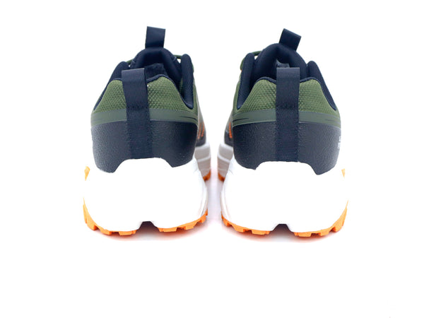 Zapatillas deportivas de running con un diseño llamativo en tonos caqui, azul marino y naranja. La suela de gran agarre en la planta exterior de color naranja las convierte en un modelo perfecto para el senderismo y la montaña.