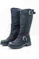 Botas de caña alta, disponibles en negro y cuero, combinan una plataforma con un tacón ancho para mayor estabilidad. La parte superior es de piel sintética con acabado liso en la puntera y fruncido en la caña. La cremallera interior facilita su calce.