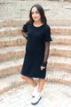 Vestido midi abotonado con falda de vuelo. Manga 3/4 y detalle de canalé en cintura.