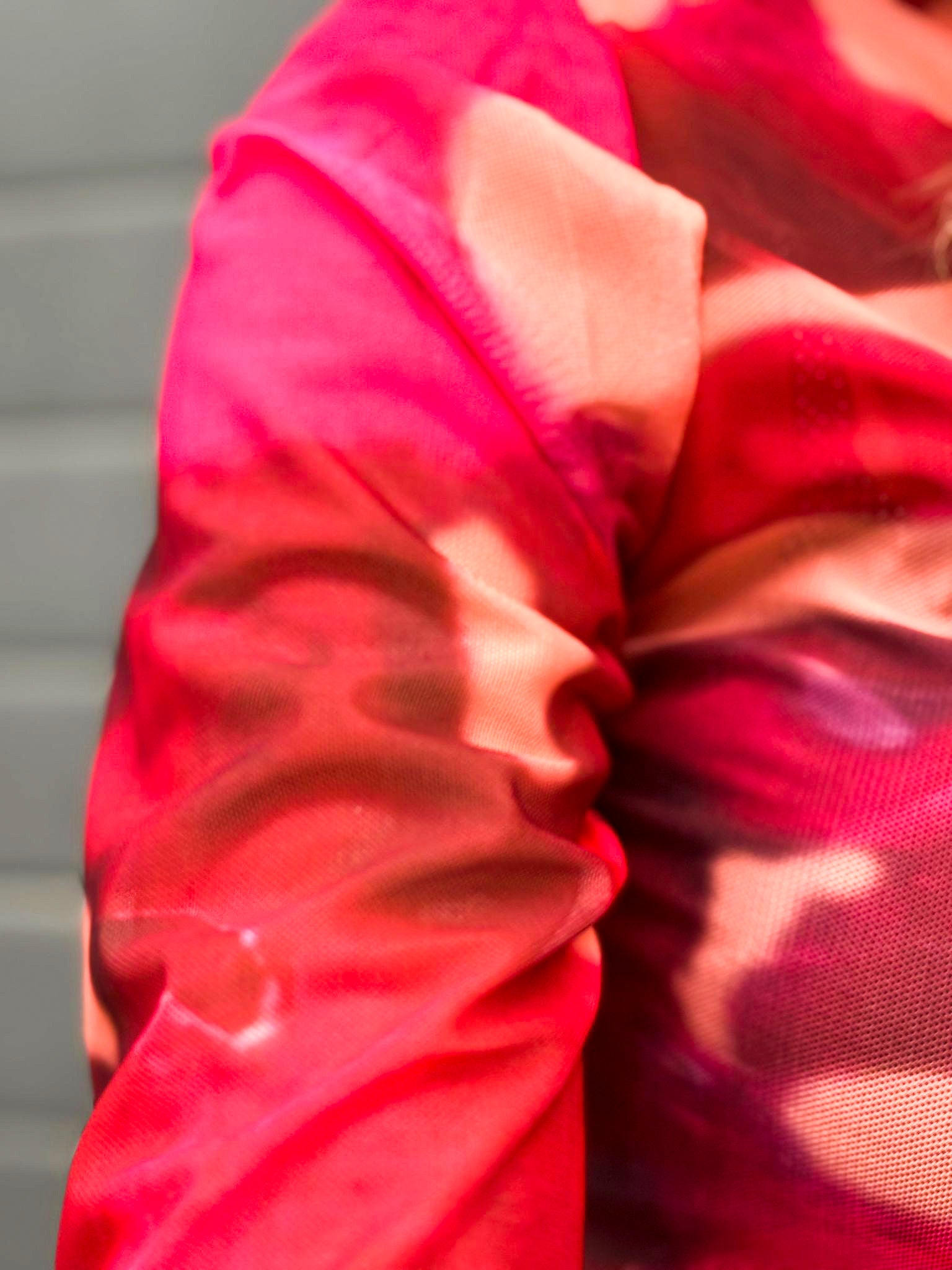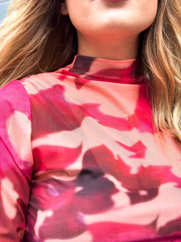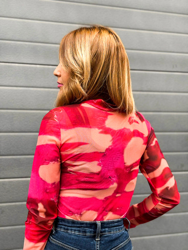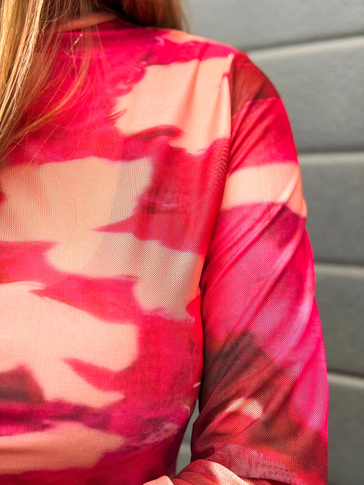 Body de manga larga y cuello alto con estampado abstracto de efecto tie-dye en tonos salmón y rojos. Confeccionado en un tejido de malla o rejilla semitransparente.