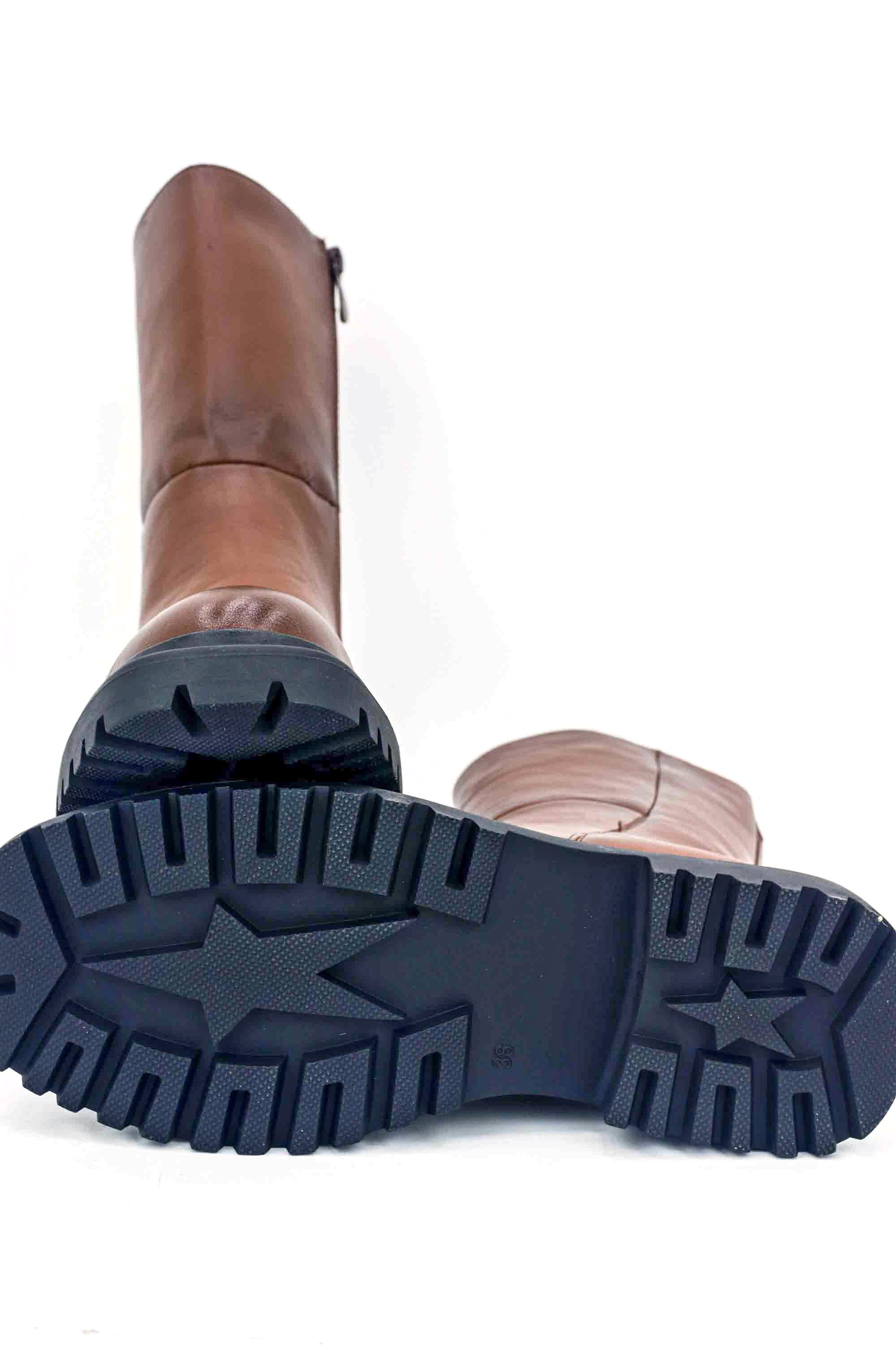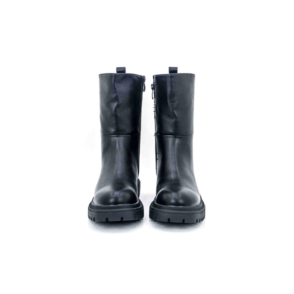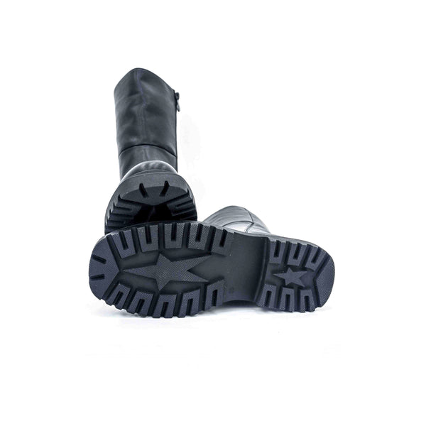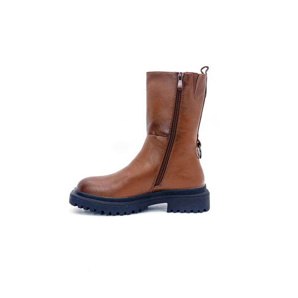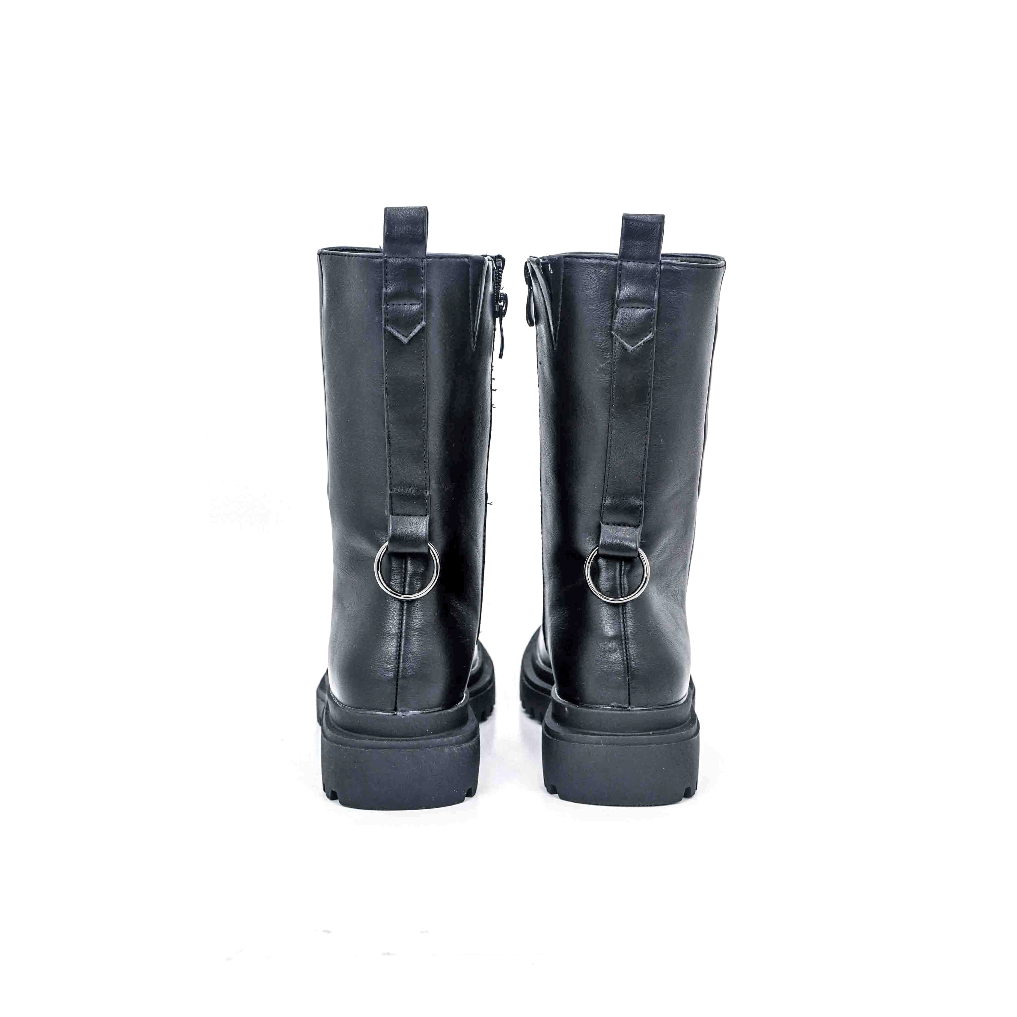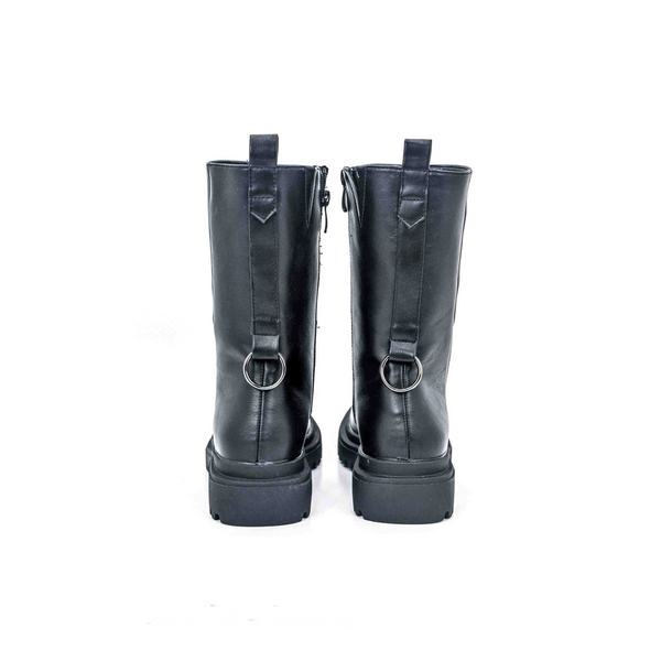 Estas botas combinan el estilo militar con un toque de modernidad. La suela track dentada te da agarre y un look robusto, mientras que el anillo metálico y la trabilla en la parte trasera añaden un detalle distintivo. La cremallera lateral permite un ajuste fácil y seguro. Disponibles en negro y marrón para que puedas elegir el que mejor se adapte a tu estilo.