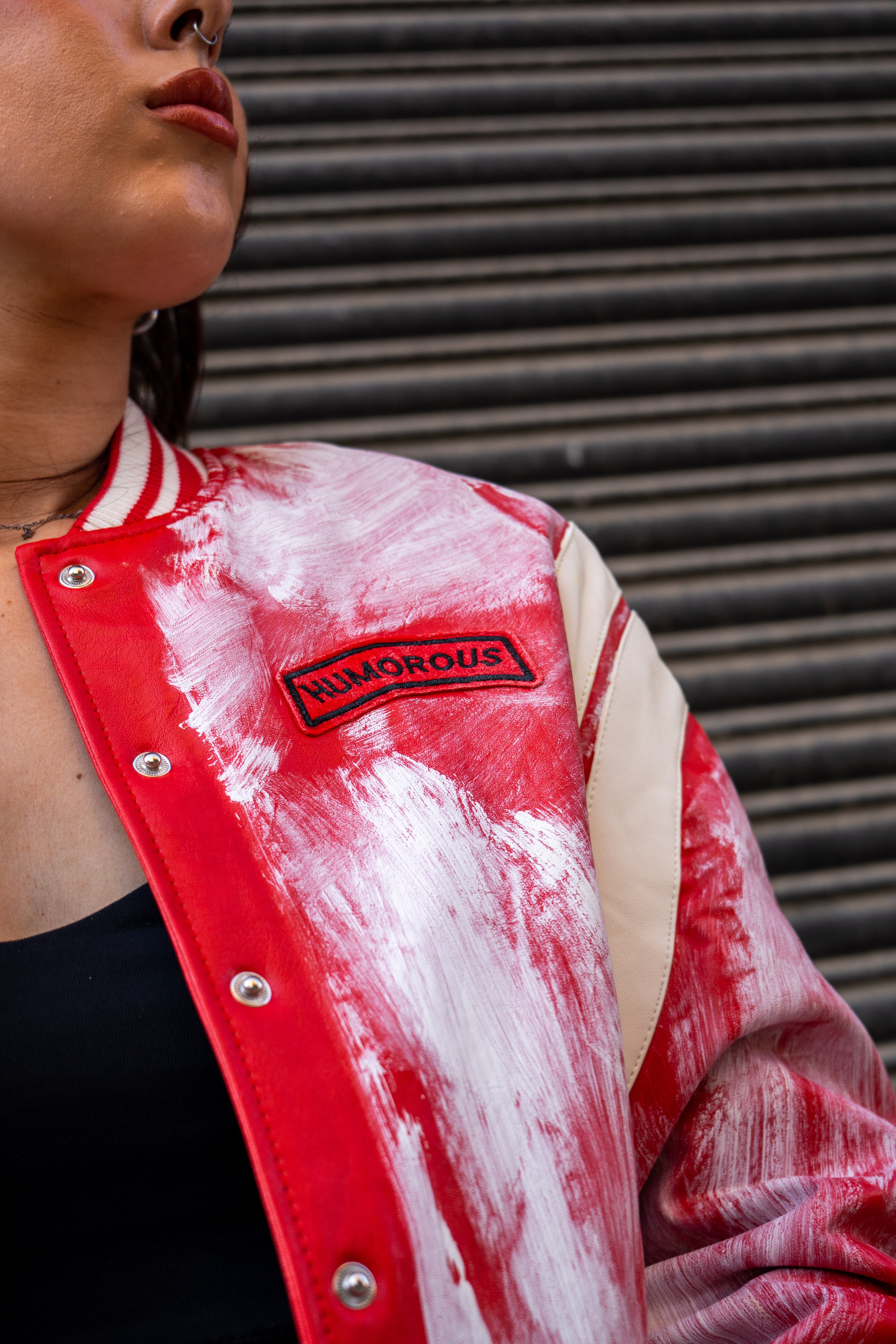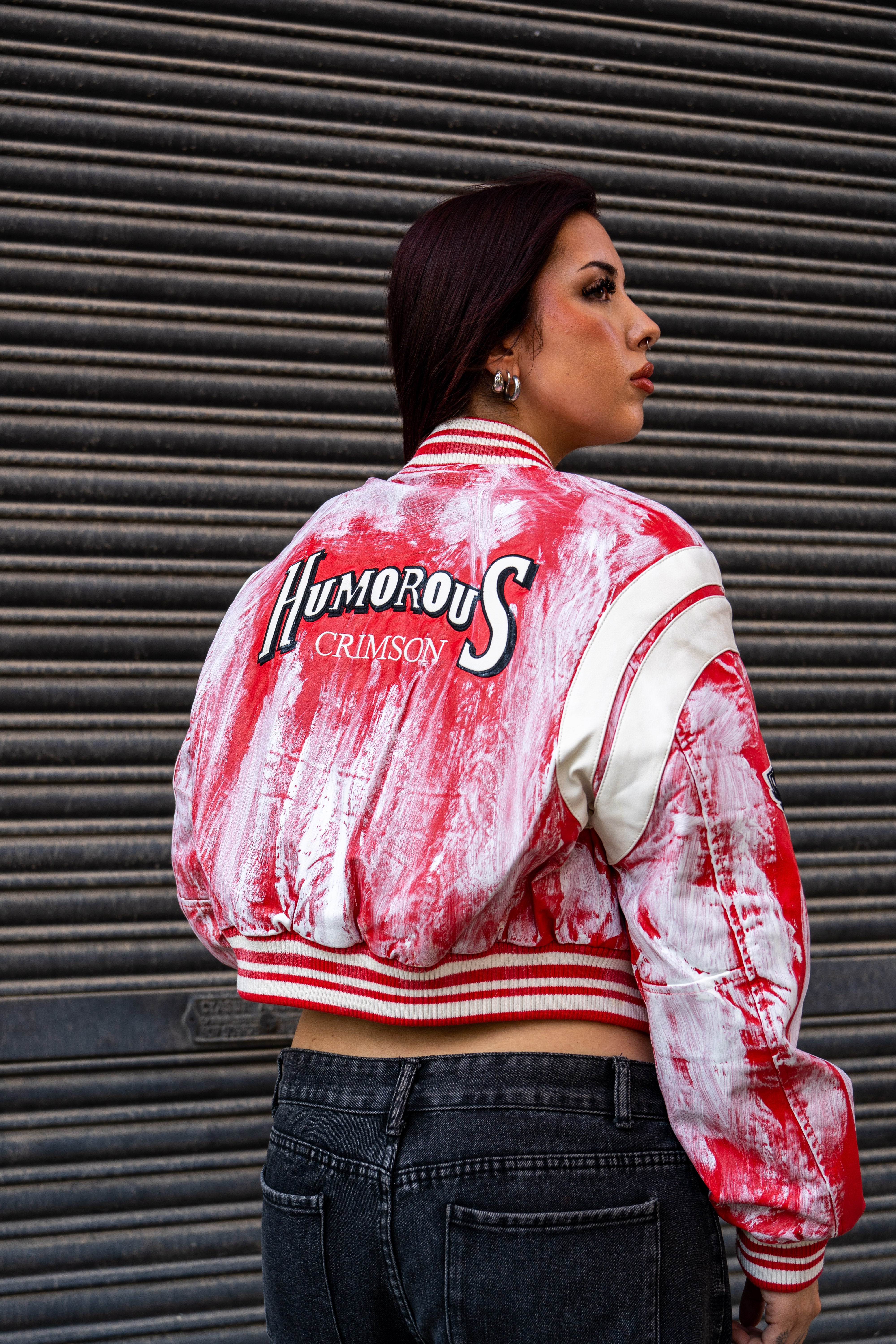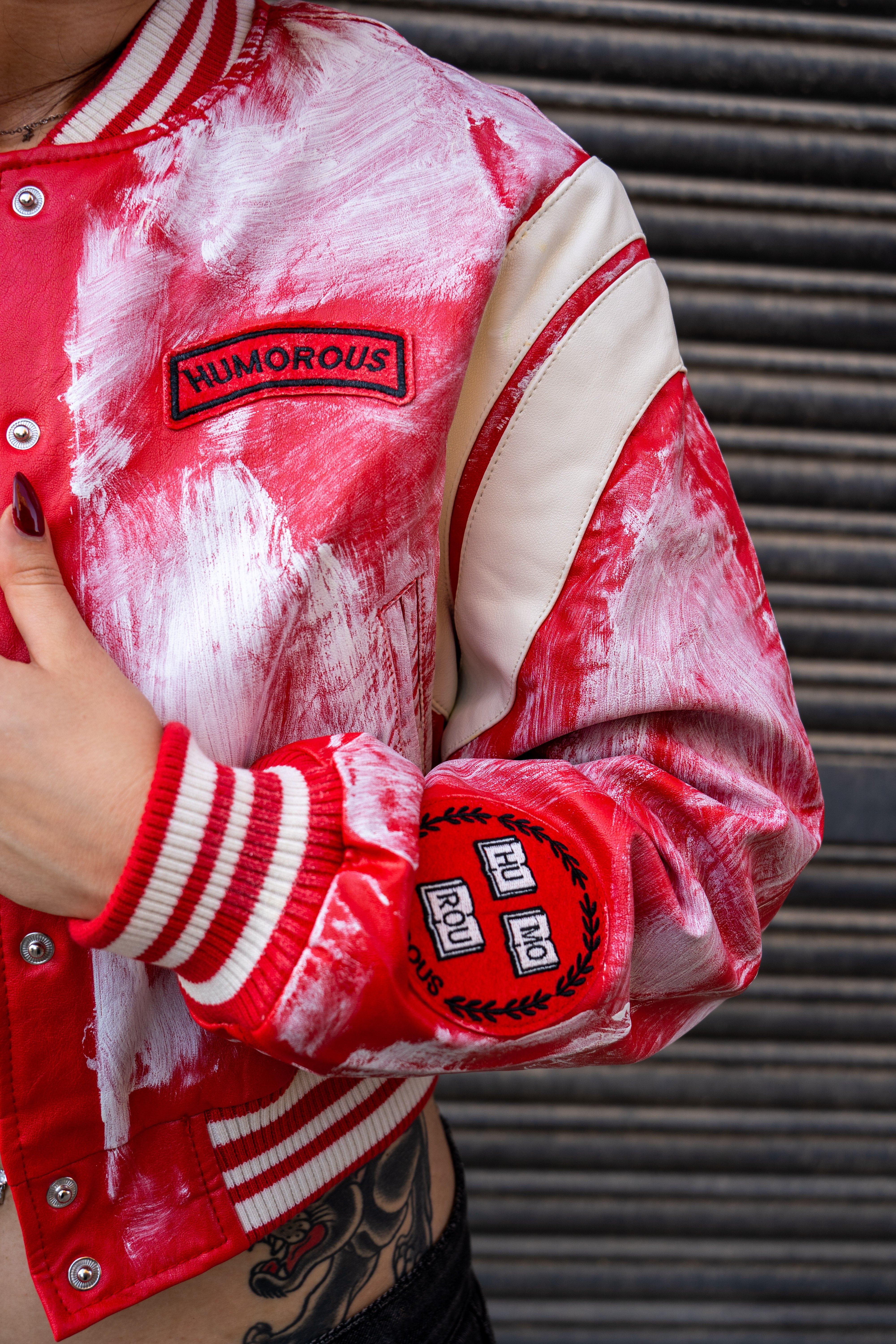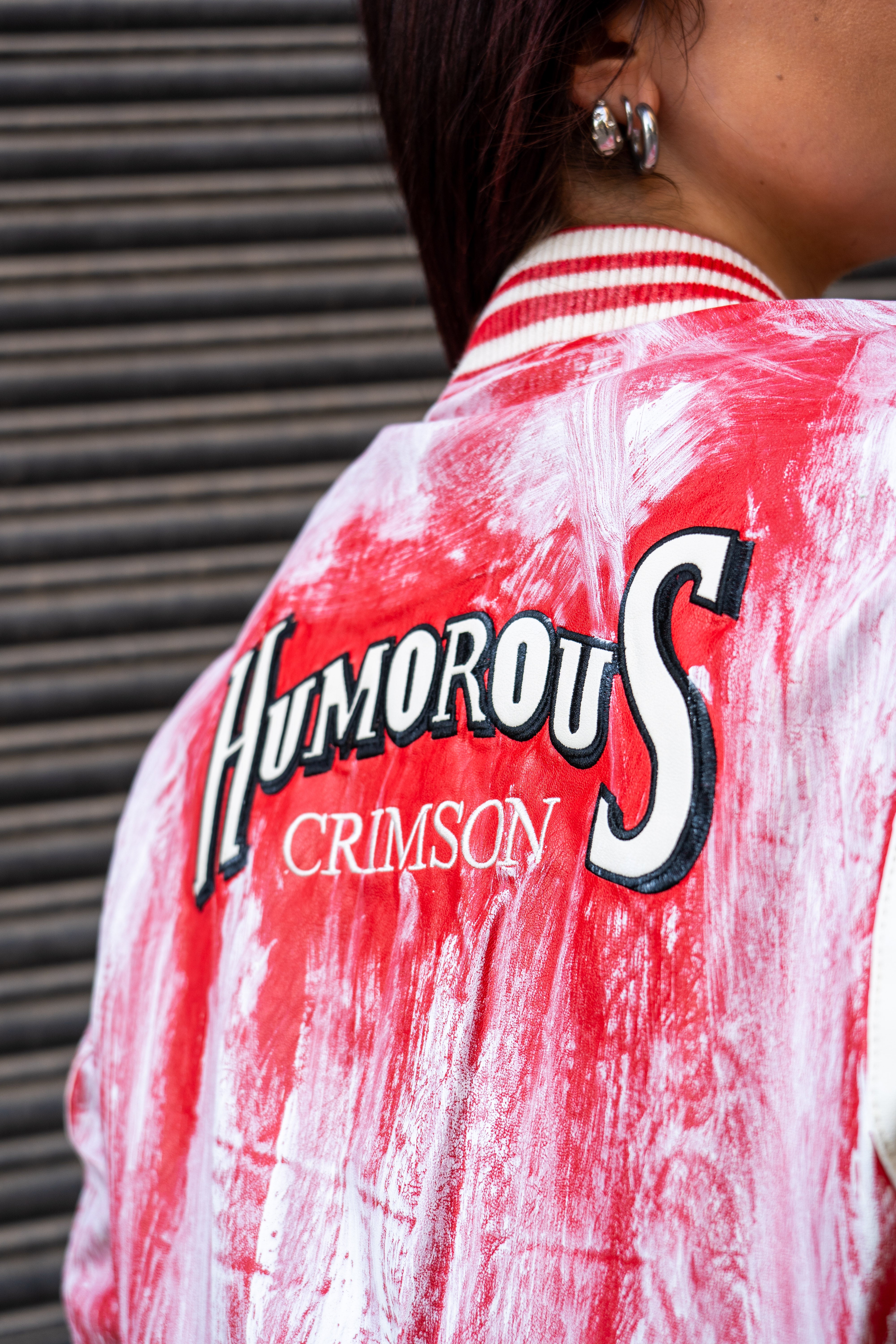 Chaqueta bomber unisex de piel sintética con pinceladas y parches bordados con la letra "A", la palabra "HUMOROUS" y la frase "HUMOROUS CRIMSON" en la espalda, junto con detalles a rayas blancas y negras en el cuello, los puños y la cintura.