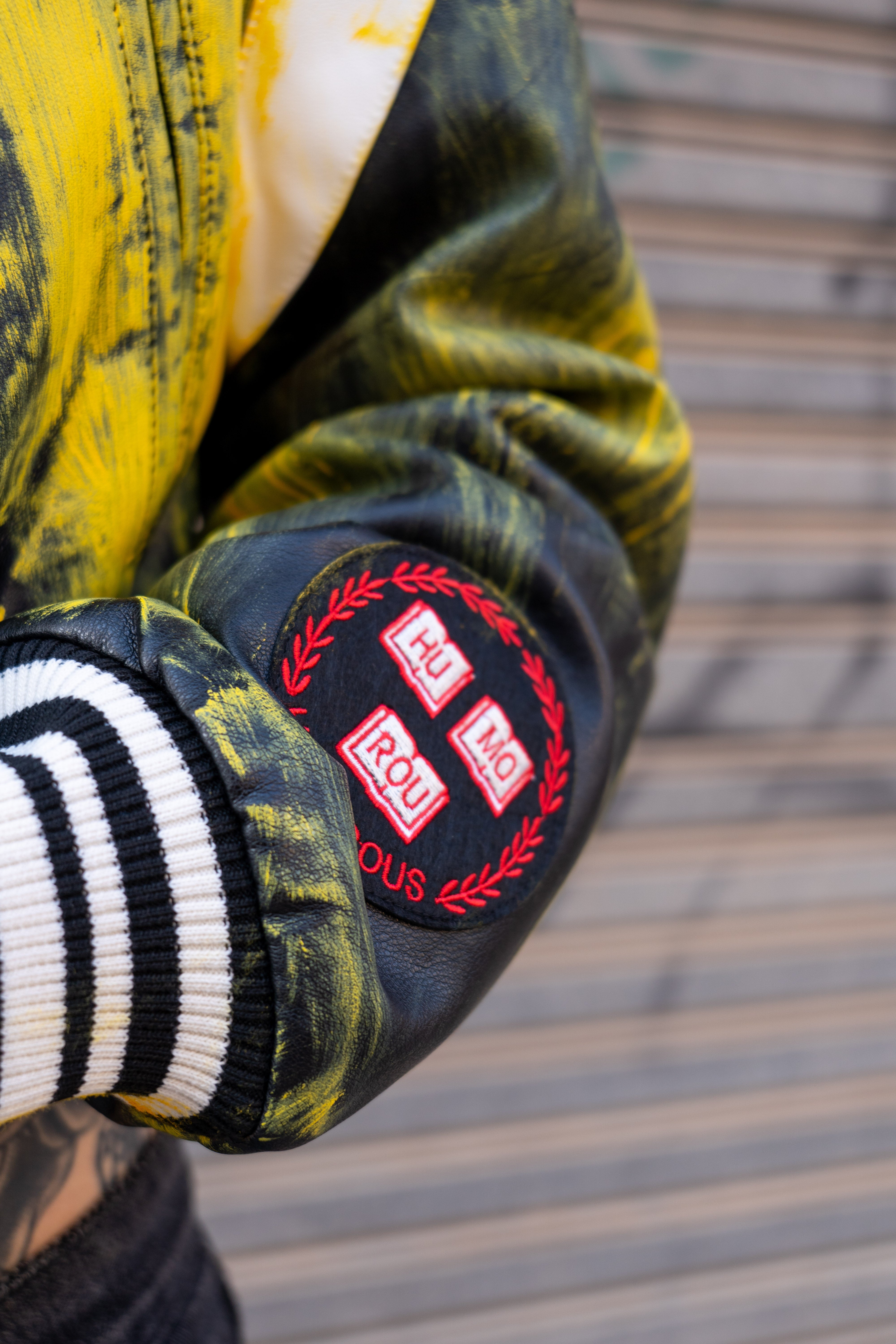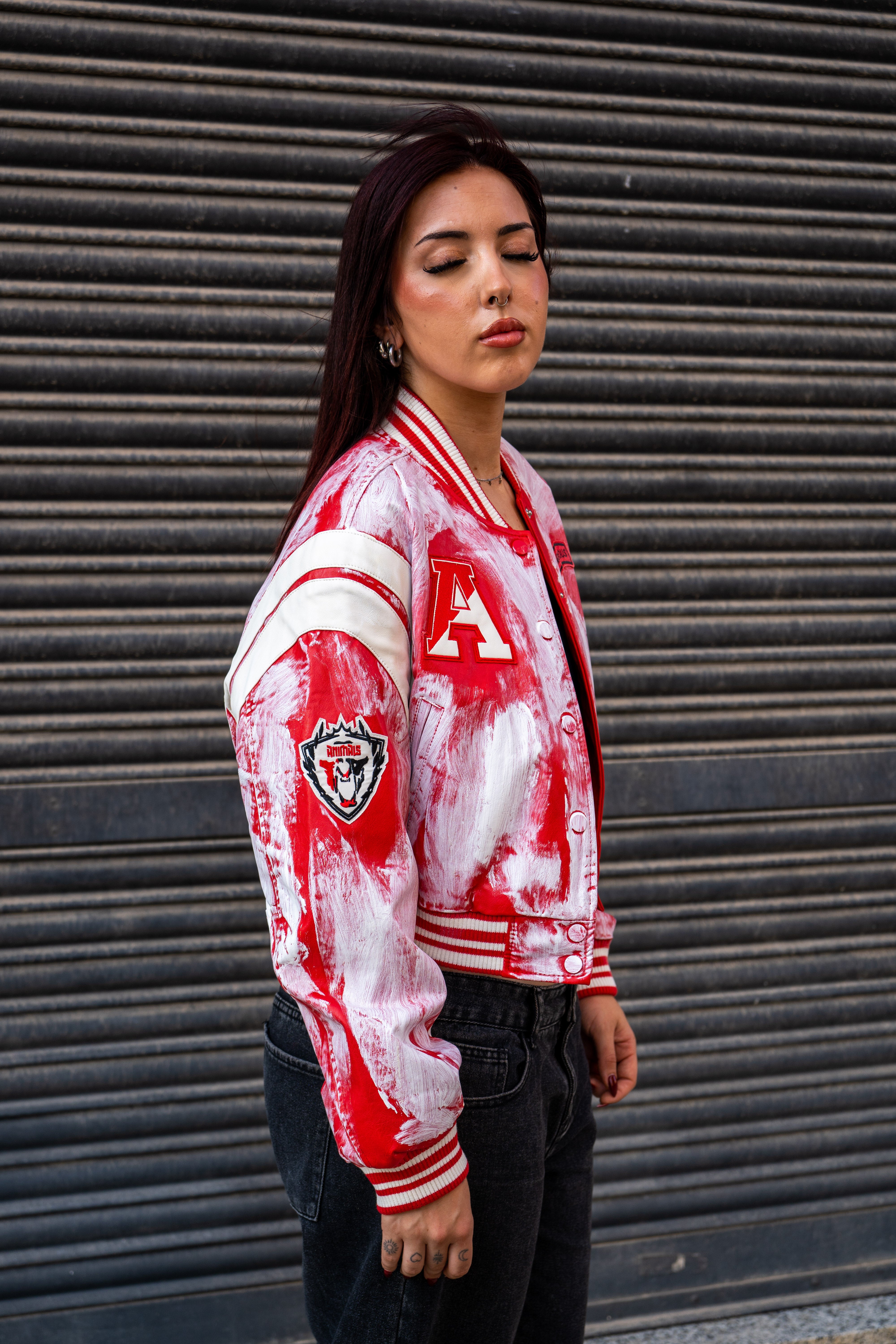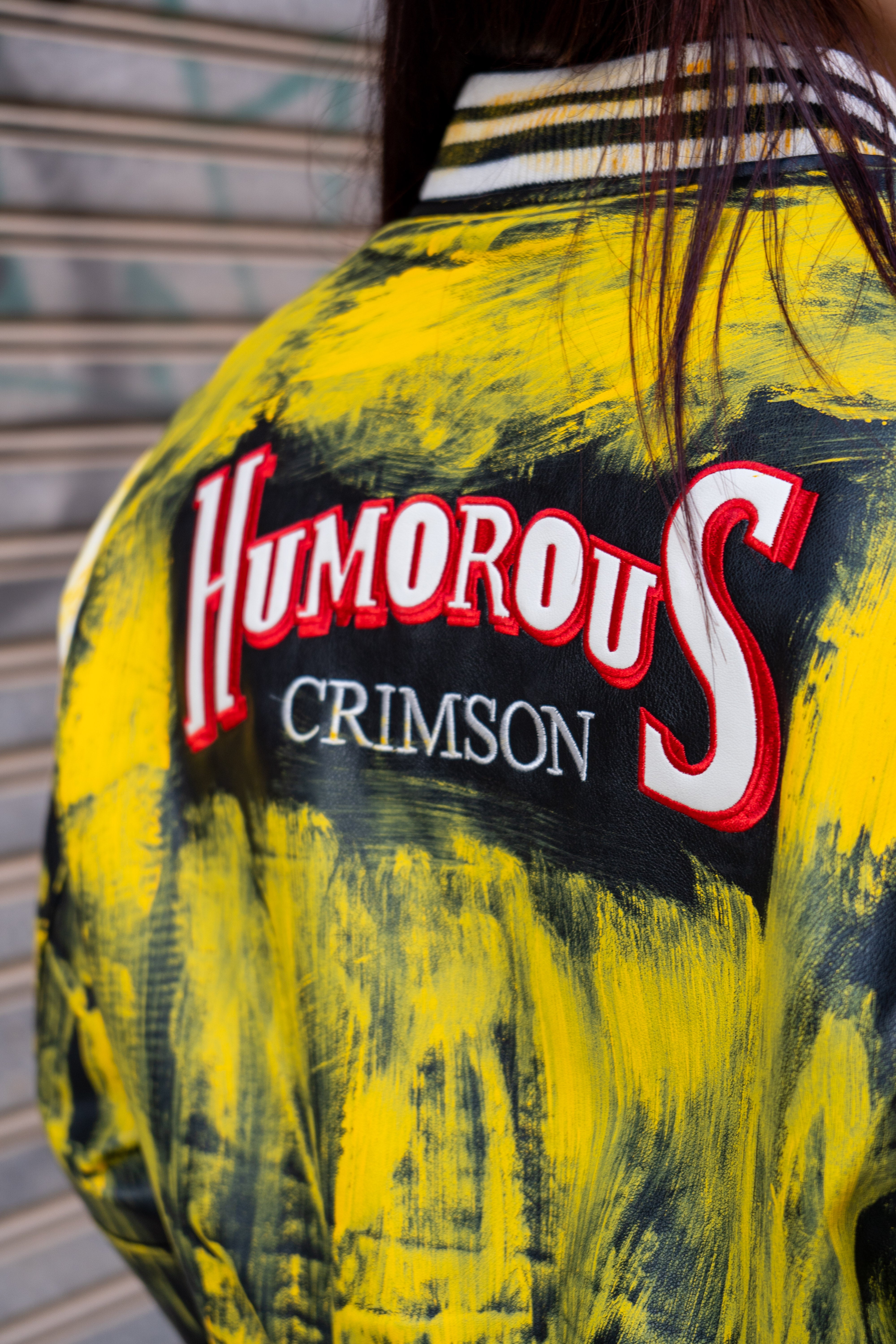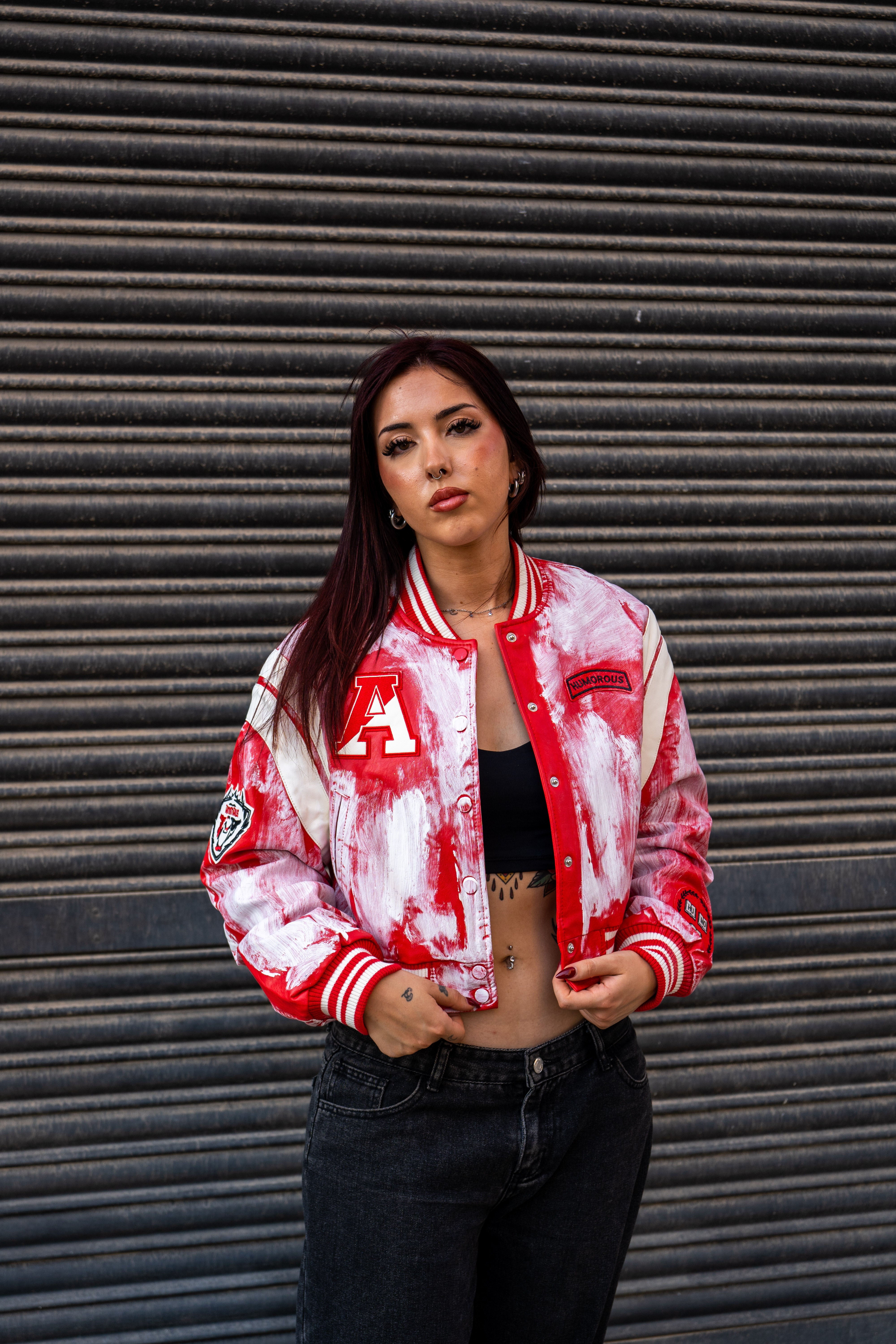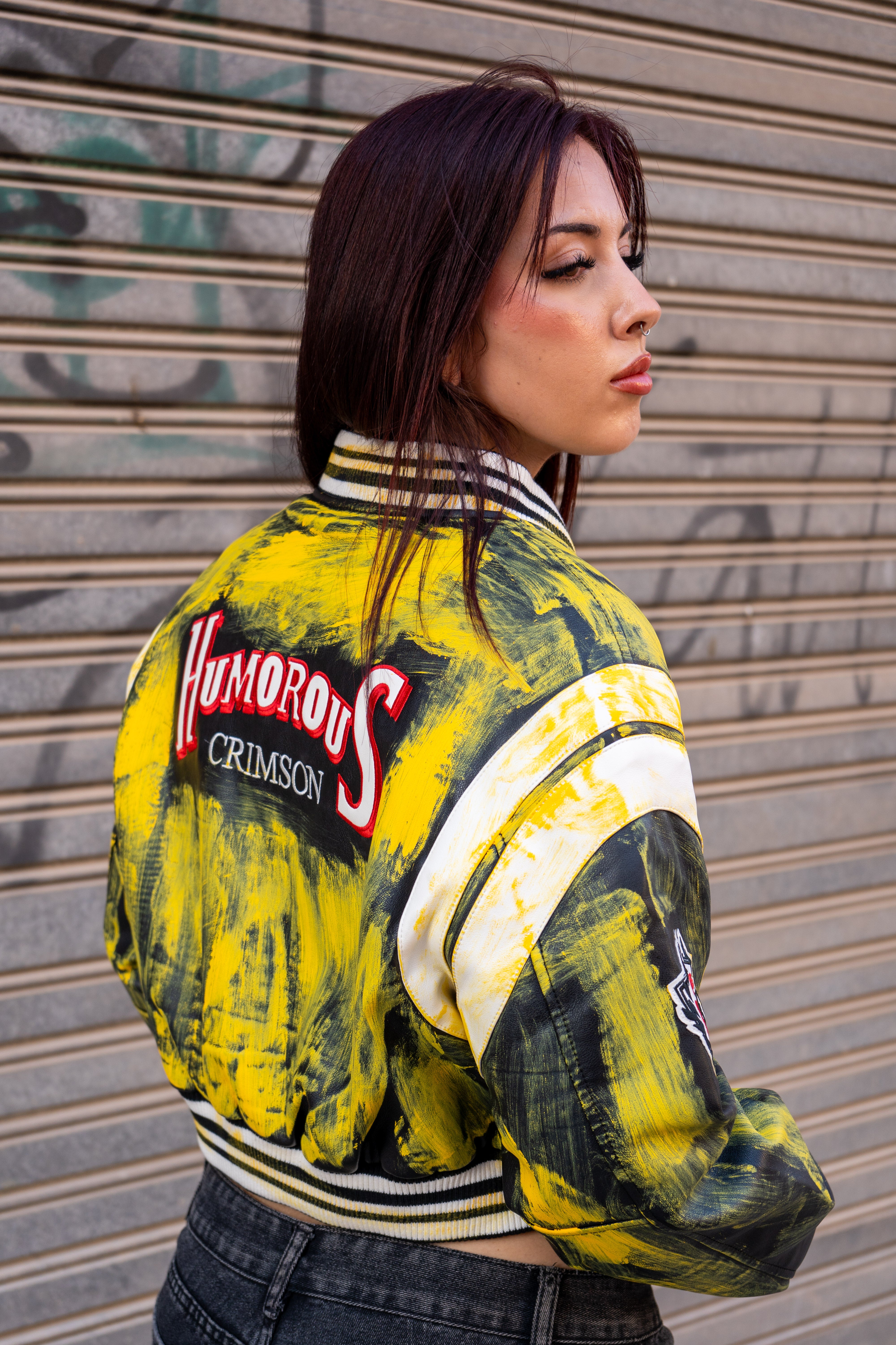 Chaqueta bomber unisex de piel sintética con pinceladas y parches bordados con la letra "A", la palabra "HUMOROUS" y la frase "HUMOROUS CRIMSON" en la espalda, junto con detalles a rayas blancas y negras en el cuello, los puños y la cintura.