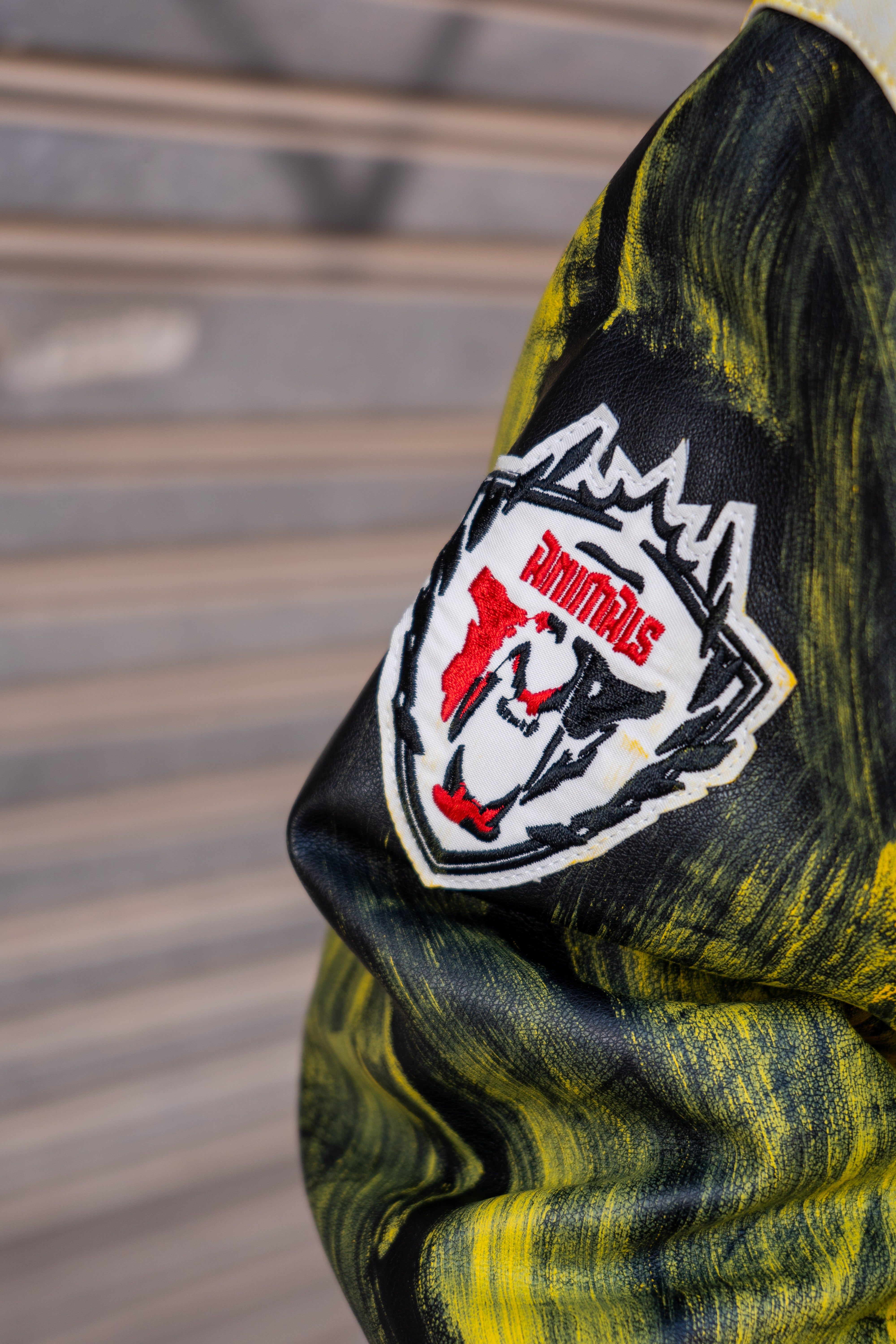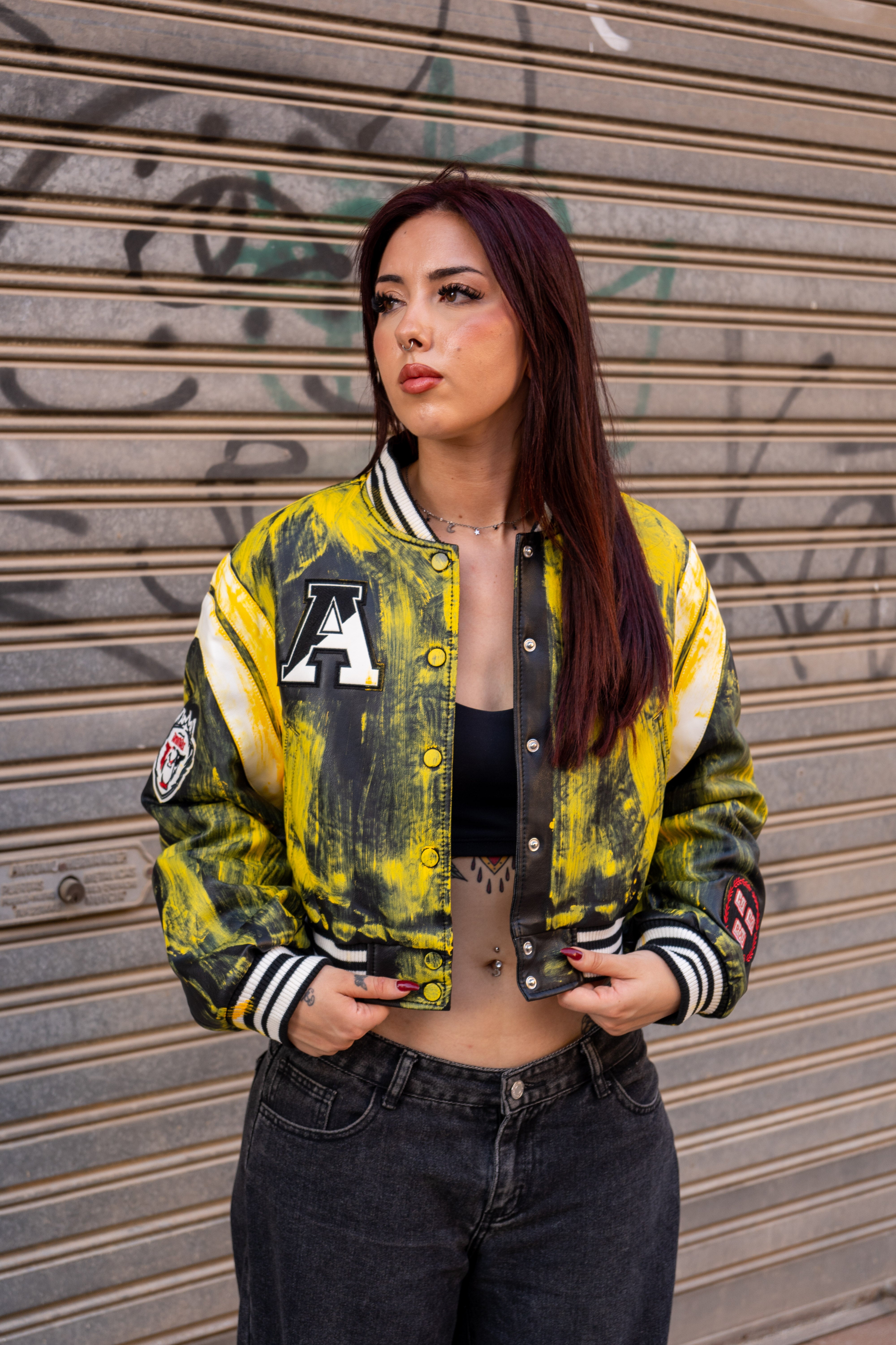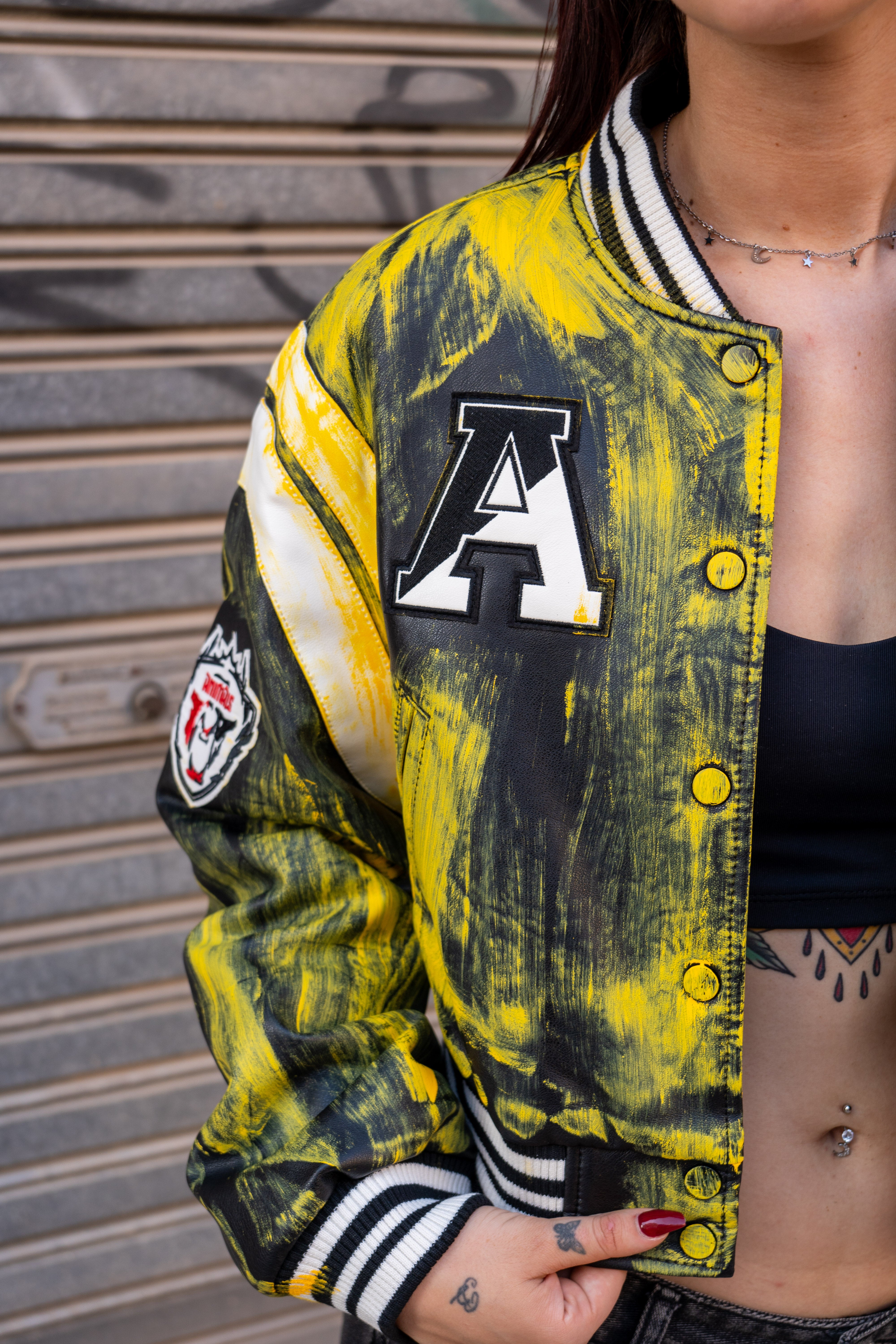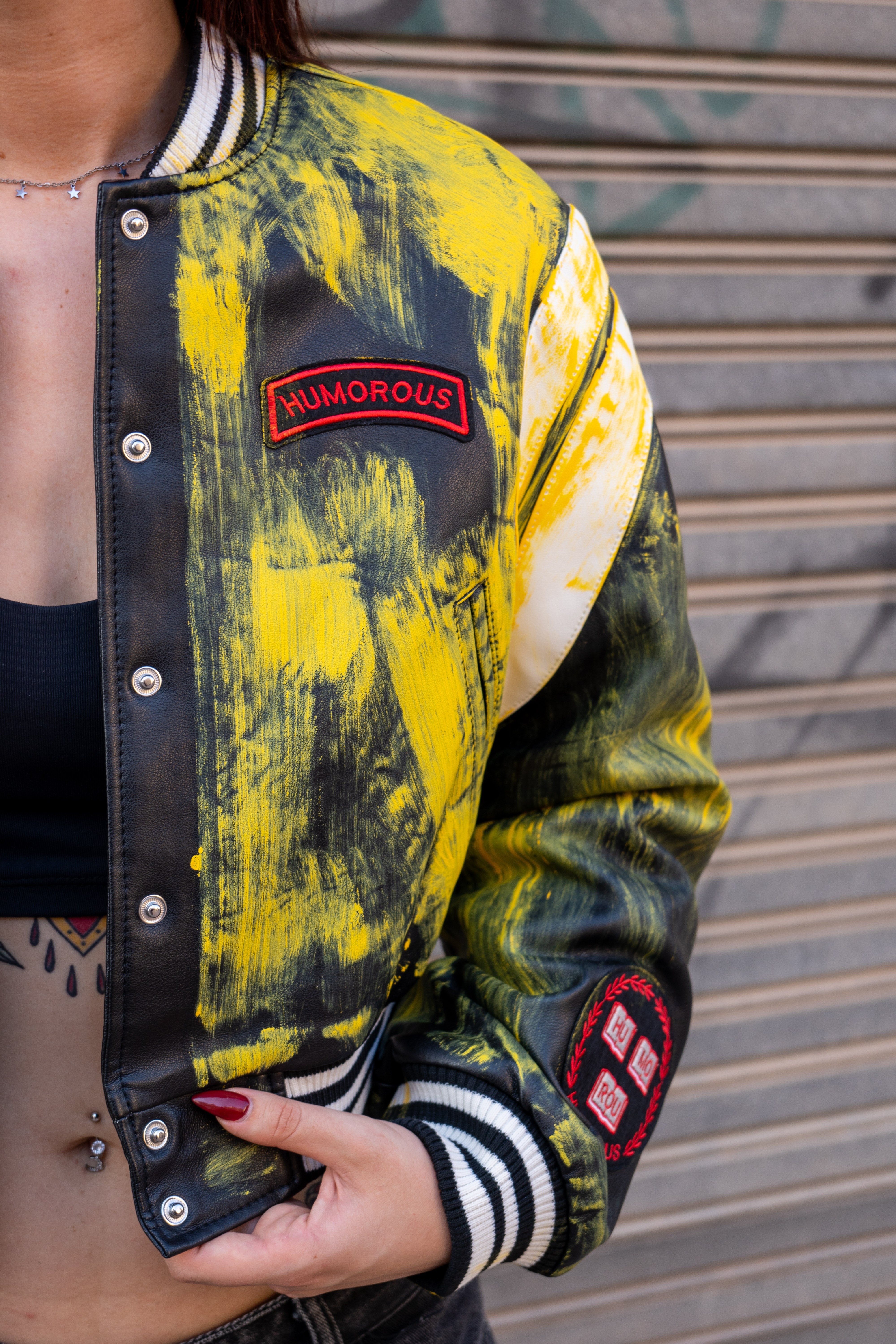 Chaqueta bomber unisex de piel sintética con pinceladas y parches bordados con la letra "A", la palabra "HUMOROUS" y la frase "HUMOROUS CRIMSON" en la espalda, junto con detalles a rayas blancas y negras en el cuello, los puños y la cintura.