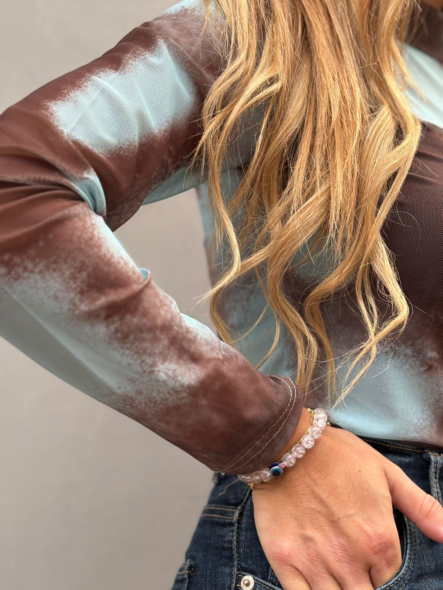 Body de manga larga y cuello alto con estampado abstracto de efecto tie-dye en tonos azul claro y marrón. Confeccionado en un tejido de malla o rejilla semitransparente.